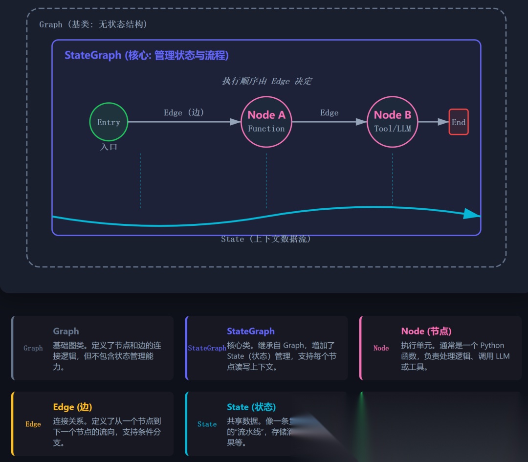 - 边(Edge) - 就像传送带,决定数据从哪个节点传到哪个节点
