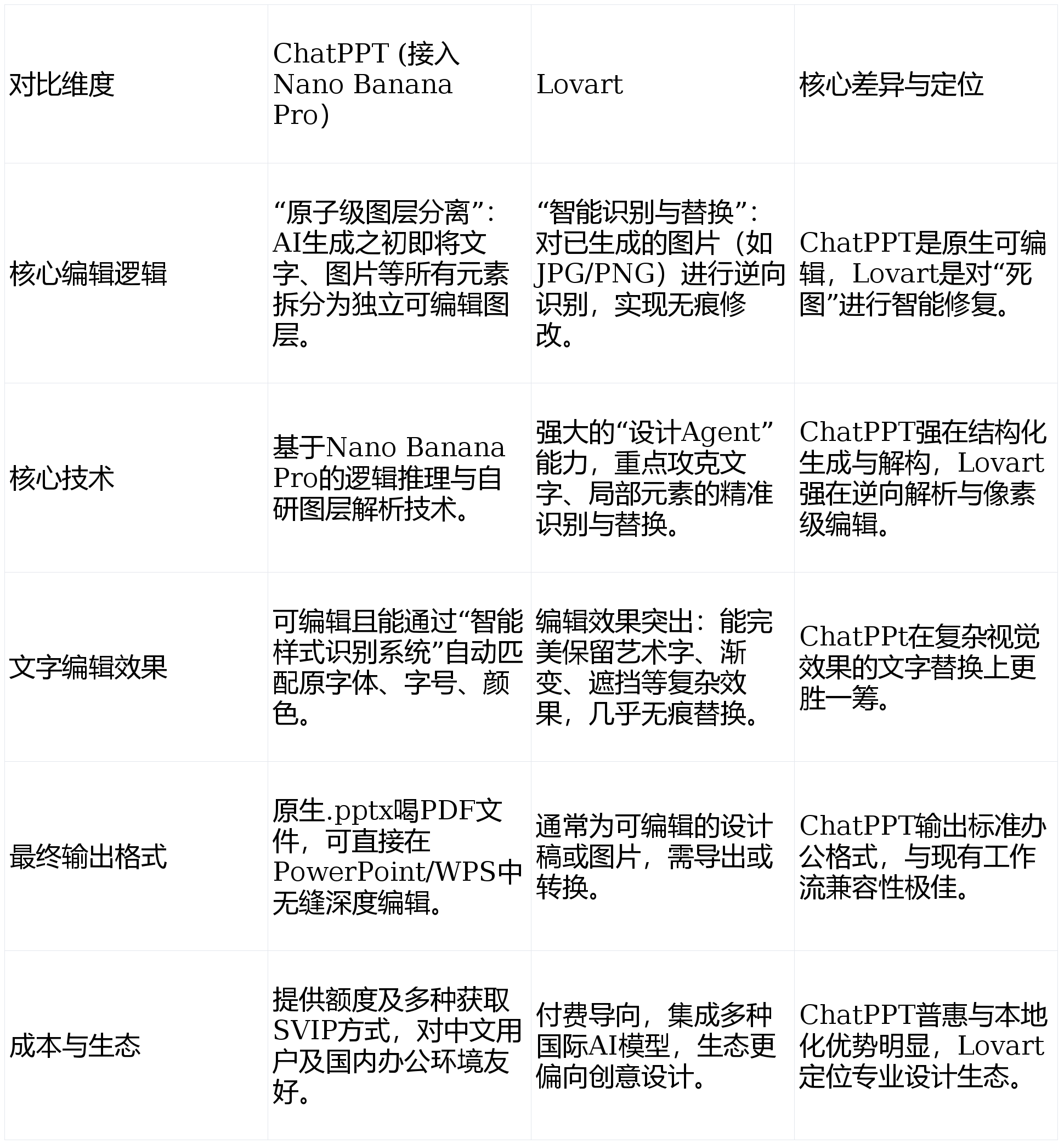 当前AI生图工具市场已出现清晰的技术分野。ChatPPT与Nano Banana Pro的整合,代表着从“静态生成”到“动态可编辑”的实质性突破。与市场上其他工具相比,ChatPPT的可编辑性实现了不同的技术路径。例如,以Lovart为代表的工具擅长对已生成的静态图片进行逆向识别和“无痕修改”,如同一位顶尖的“图片修复大师”。而ChatPPT走的是“原生可编辑”路线——它在生成之初,就通过“原子级图层分离”技术,将文字、图片等所有元素预置为独立图层,从一开始就搭建好了一个结构清晰、每个部件都可随时替换的“智能建筑”。