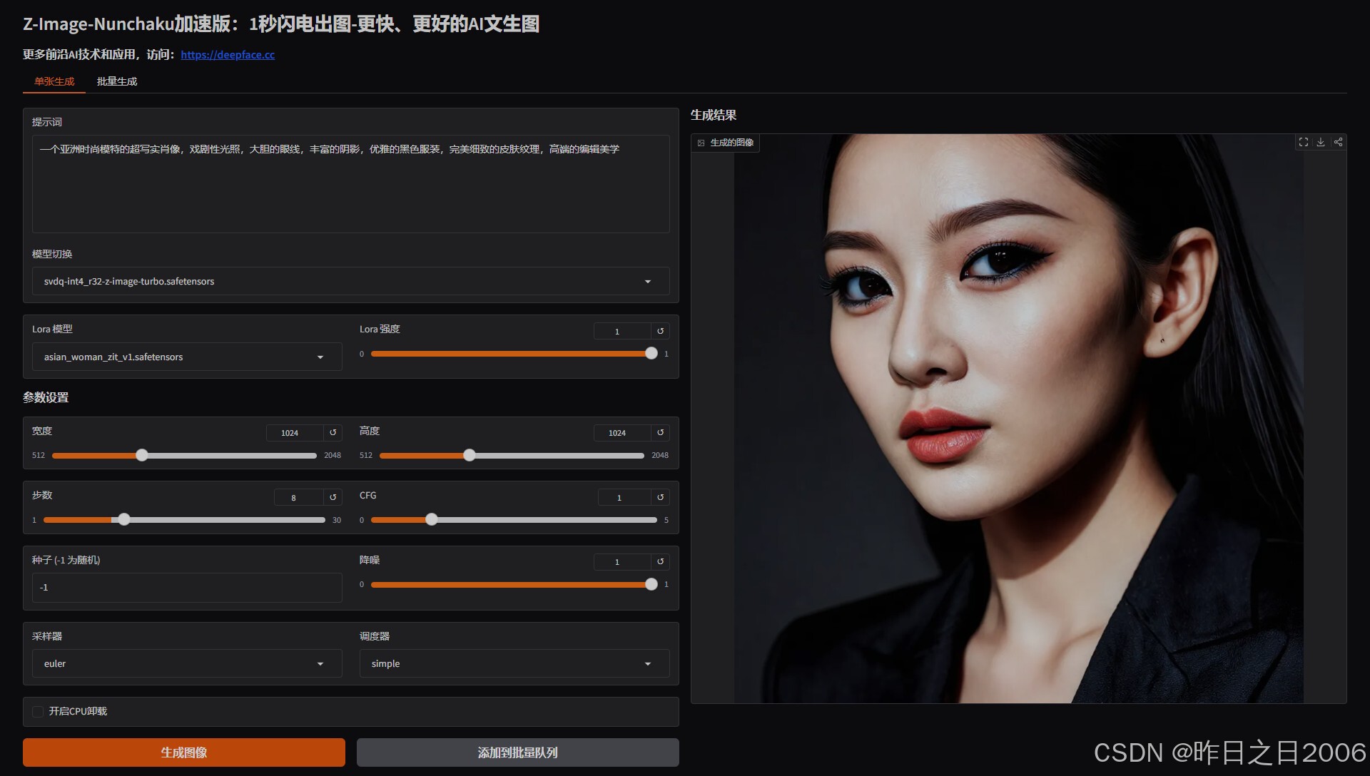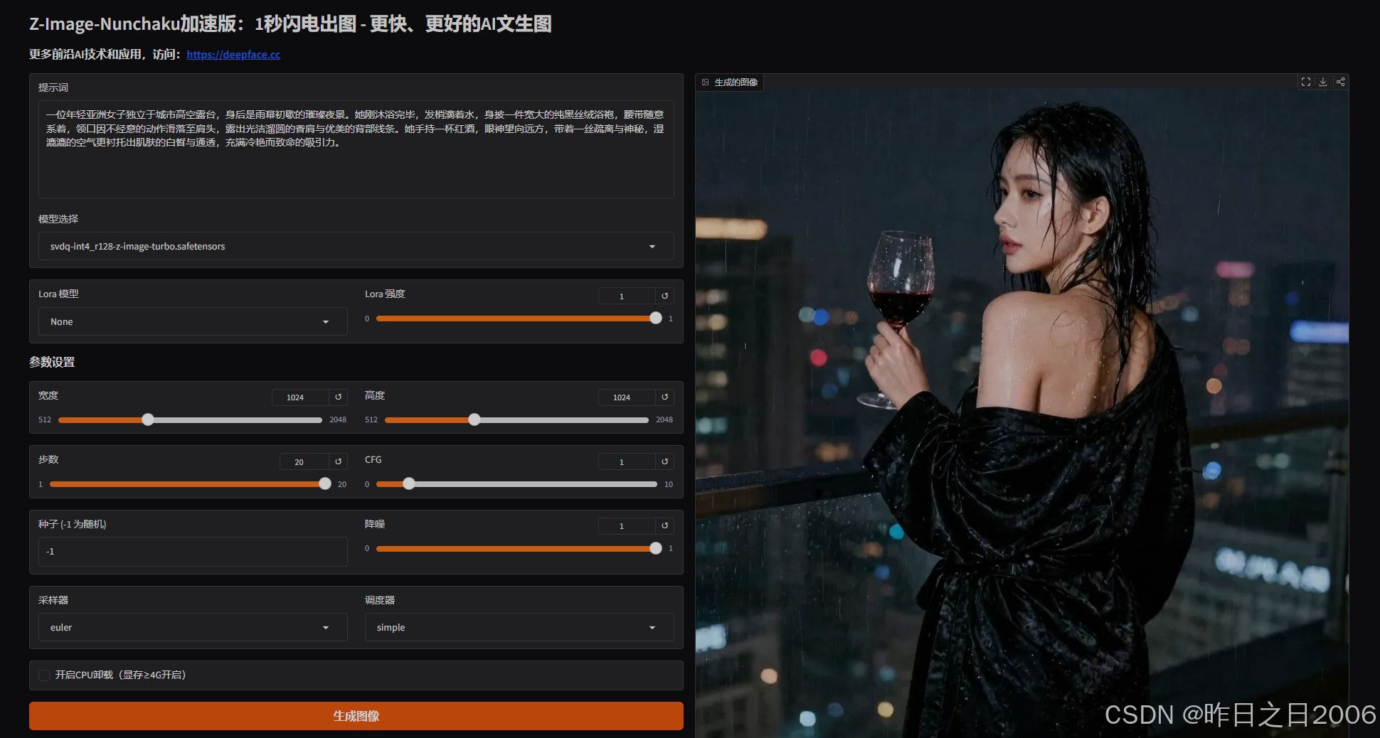 ComfyUI适合专业用户,可自由定制节点,功能更丰富,操作更自由。关于Rank,比如模型文件名开头的“svdq-int4_r128”,这里的 r就是rank的缩写,请根据自己的需求选择 (32=快速, 128=平衡, 256=最佳质量-仅INT4),数值越大,推理速度越慢,生成效果越好。模型使用的也是Nunchaku最新开源的 4-bit Z-Image-Turbo,兼容原版lora,集速度和生