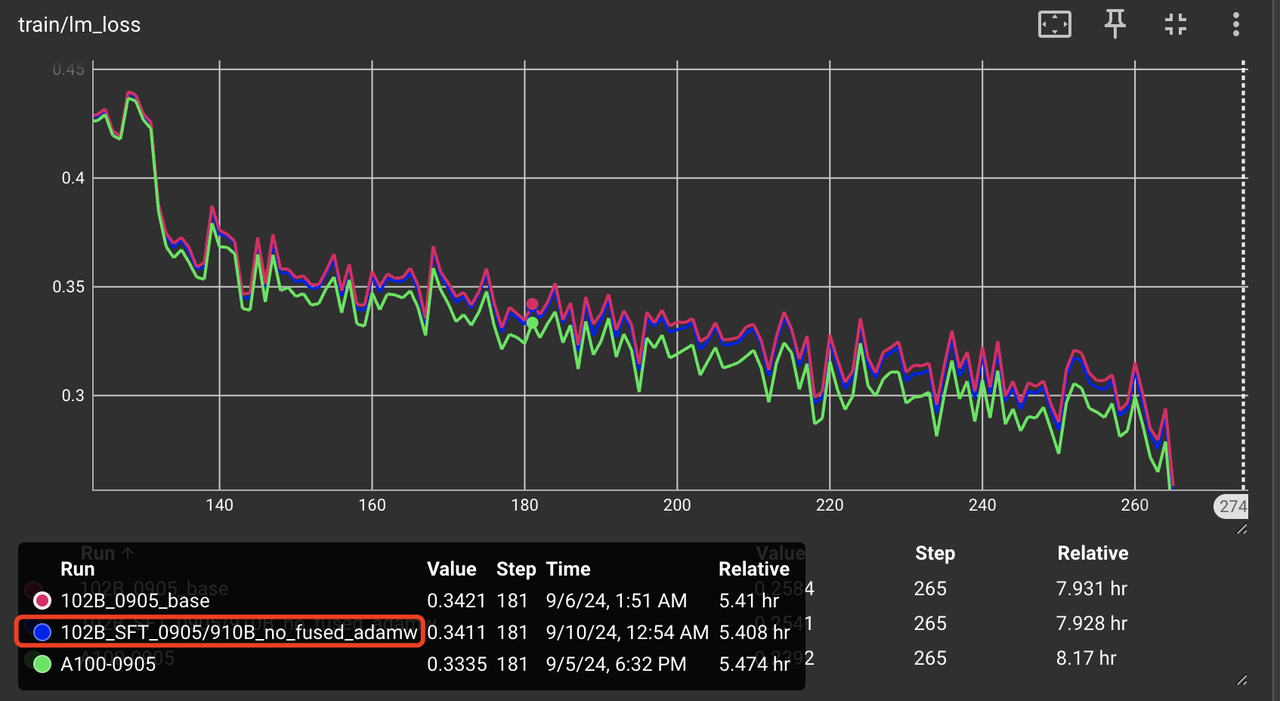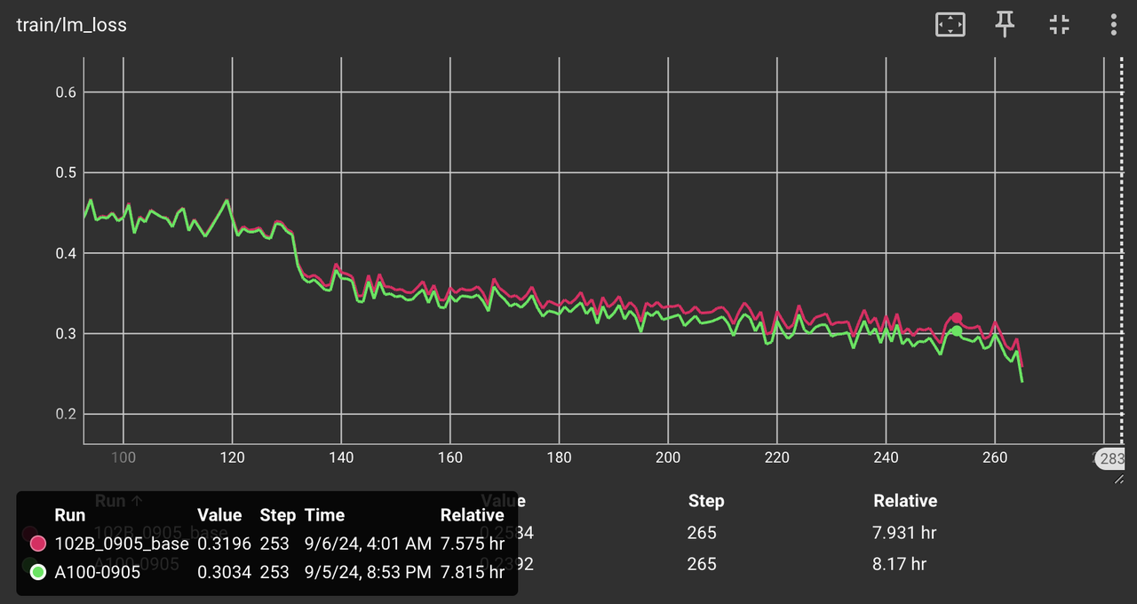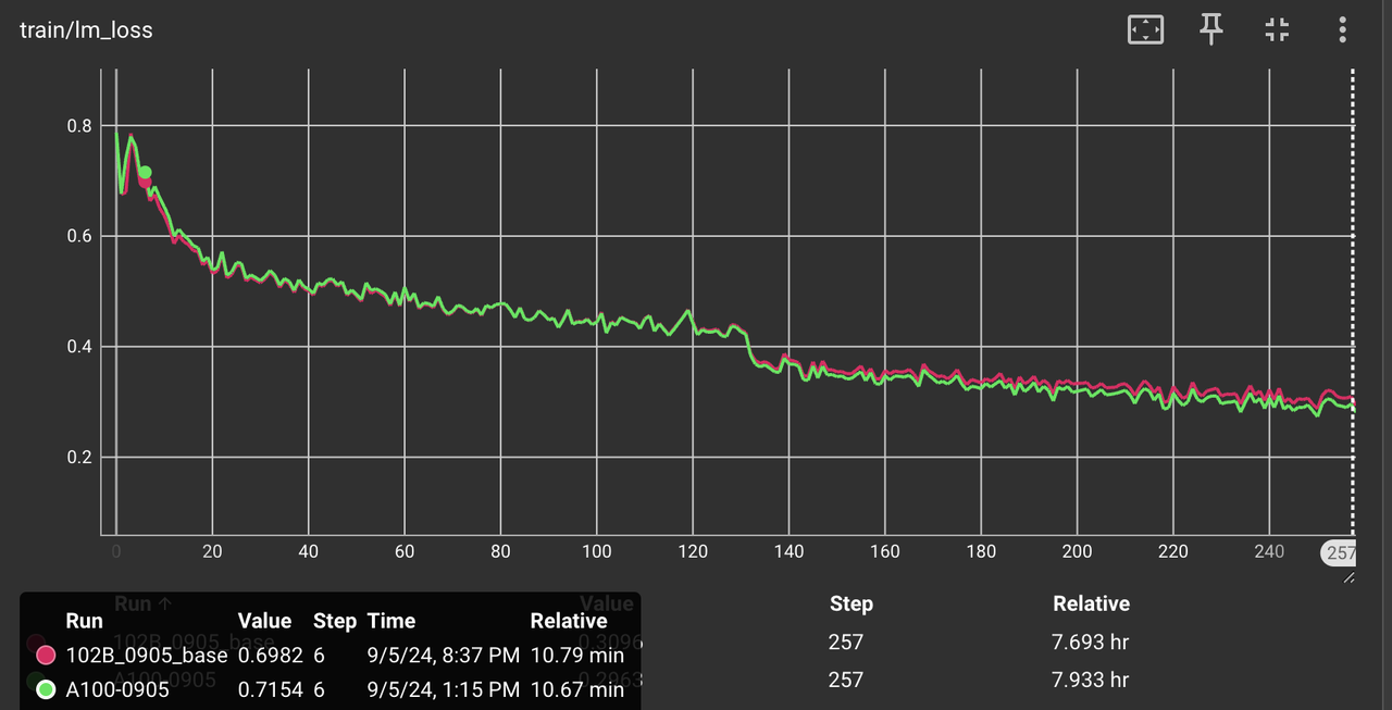为此,我们将 rms_norm 换成了 apex 中的 PyTorch 组合实现,不使用昇腾提供的torch_npu.npu_rms_norm,得到如图 7 所示的微调 loss 曲线。从图中可以看出,A2 的 loss 曲线已经完全和 A100 对齐。并且后续对微调好的权重做了下游评测,发现平均得分已经基本和 CUDA 一致。