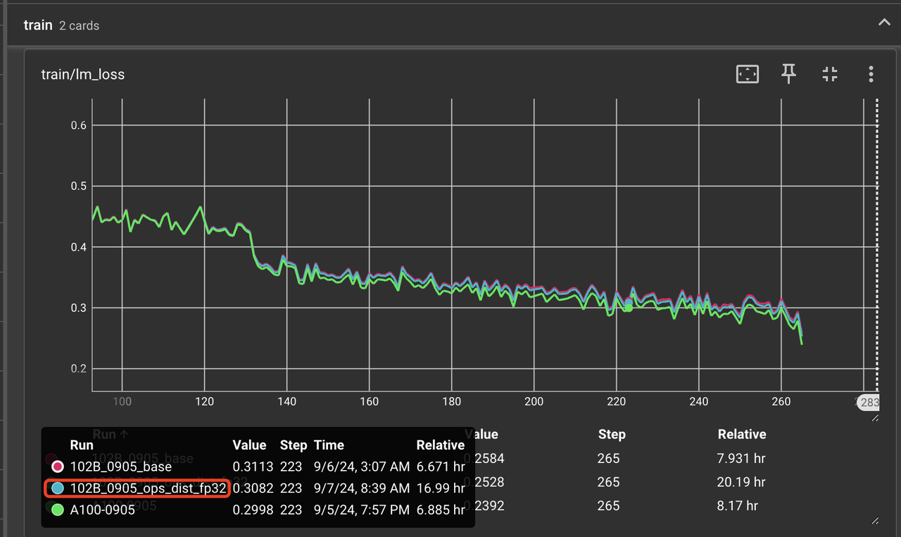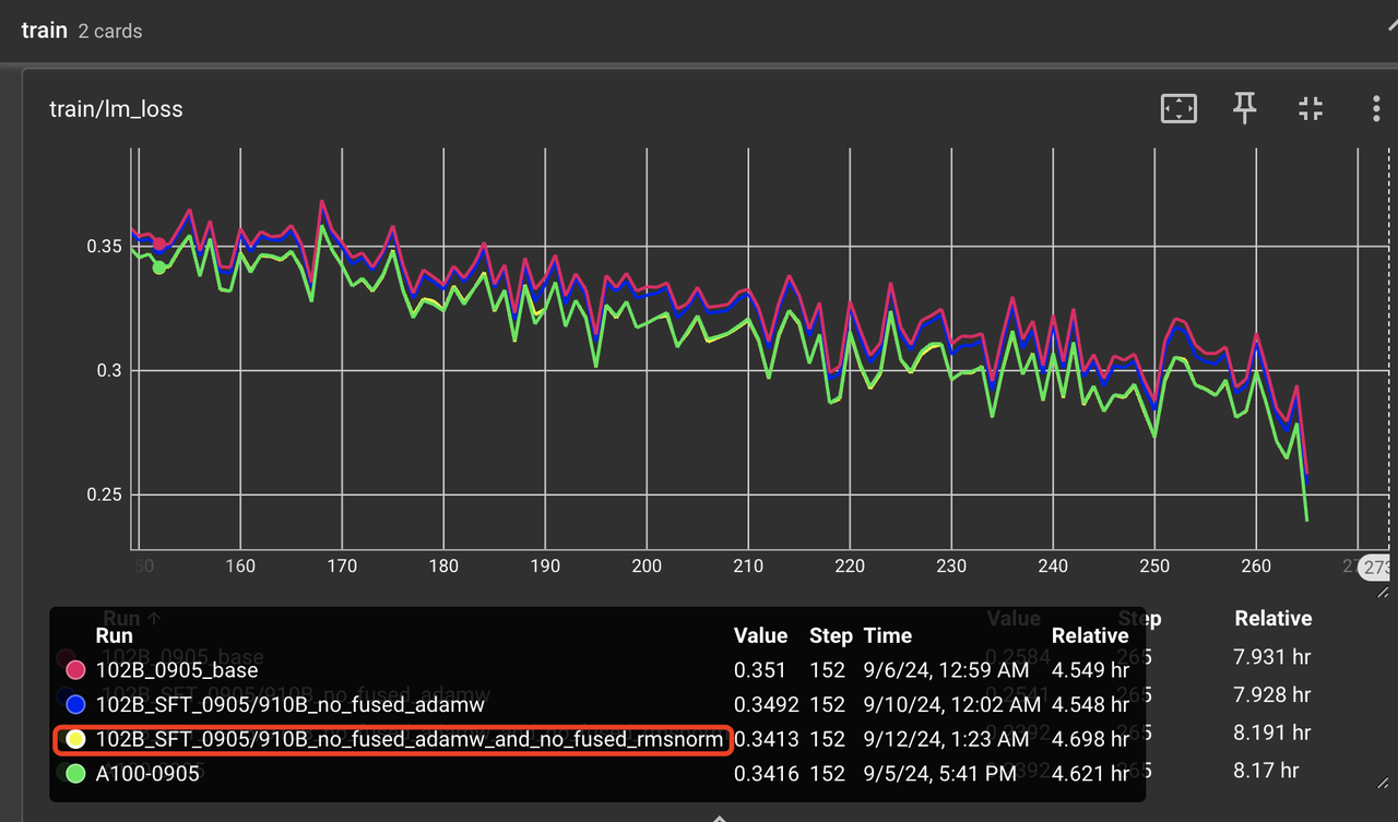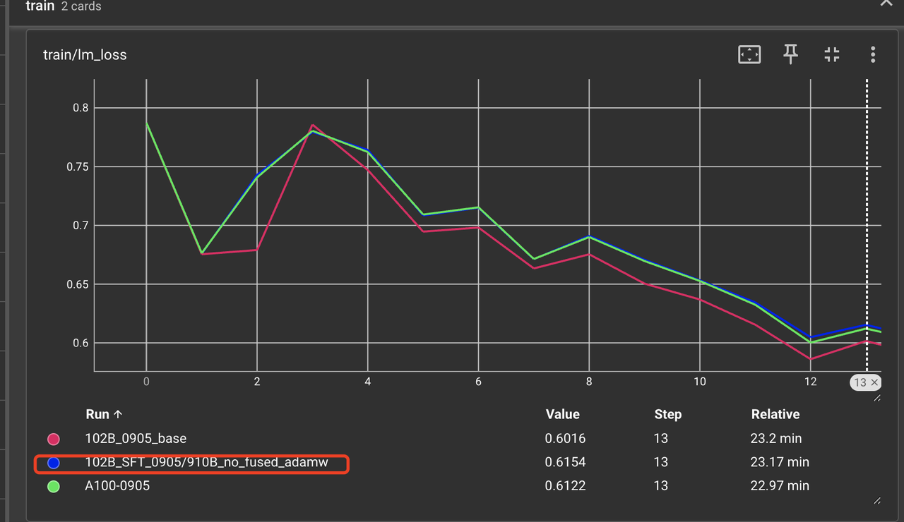 1. 将 layer_num 改为 1 层对比 loss 曲线。由于 102B 的微调需要的卡太多,且微调时间太长,导致实验的成本很高。所以曾尝试将模型的 layer_num 改为 1,即将模型砍为 1 层,然后对比A100和A2的 loss 曲线,看能否找出loss差距。但由于改成 1 层后模型的表示能力下降,且会减少误差的累计效应,对通过 loss 来排查算子精度问题虽有一定的帮助,但作用并不大。在 rms_norm 有精度问题的情况下,loss 曲线依旧是对齐的。