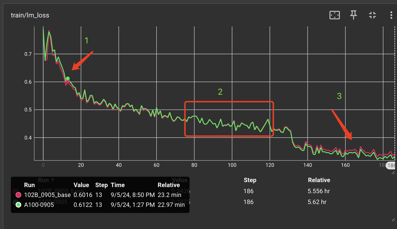 图 2 中可以看到,在“1” 处 loss 有的较大误差,A2 的 loss 值比 A100 上低了约 0.011,相对误差 1.8%;在“2”处 loss 基本一样;而在第 2 个 epoch 的中,“3”处 loss 明显变大,且 A2 loss 值比 A100 的 loss 值高约 0.01 。