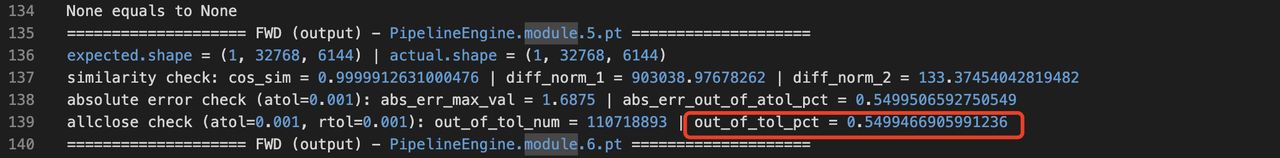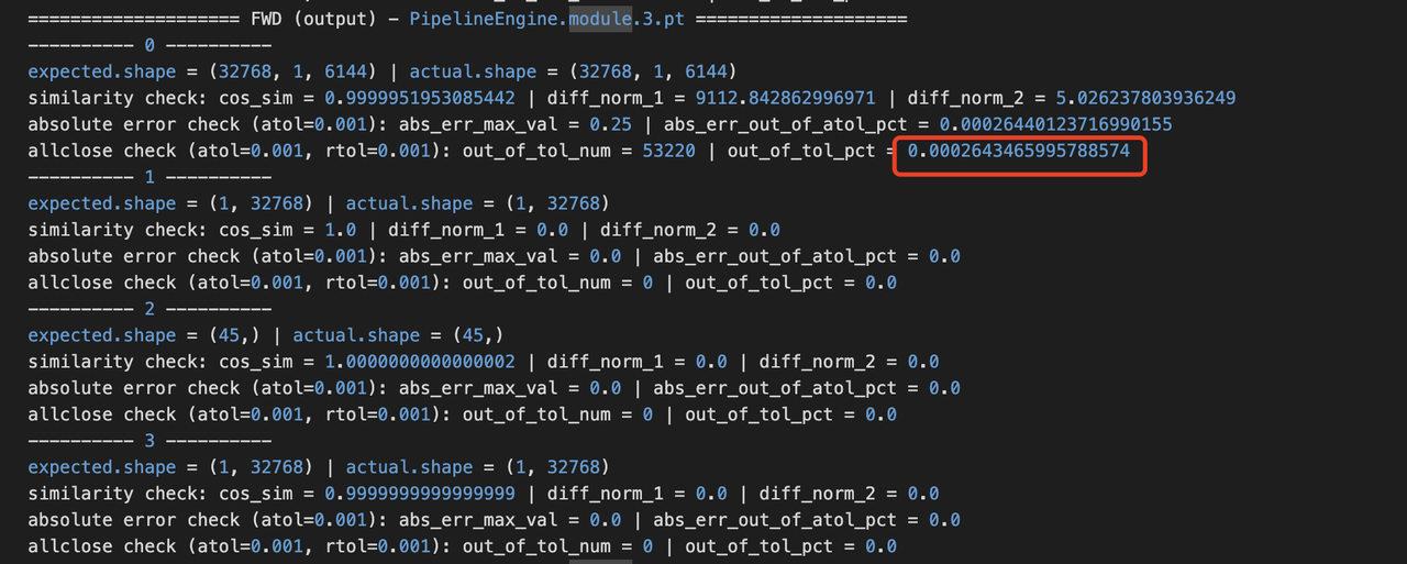 2. 将 layer_num 改为 1 层,使用 torch.nn.Module 级别的逐 module 层对比工具,跑 1 个 iter 然后逐 module 层对比和 CUDA 的计算结果。发现 module.3 层的输出结果在 atol 和 rtol 为 1e-3 的情况下,只有 0.026%的数据和 CUDA 的计算结果不 allclose。但下一层 module.5 却有 54.99%的数据和 CUDA 的计算结果不 allclose(module.4 为空,所以下一层是 moudle.5),因此怀疑是 module.5 内有计算错误。排查模型结构后,发现 module.5 正是 RMSNorm 层。这一结论和 3.2.3 部分中发现的“rms_norm 需要使用组合实现, loss 才能对齐”得出的结论是一致的,即 rms_norm 有精度问题。但这种方法对优化器算子的排查起不到作用,只能排查前向和反向所使用的算子。