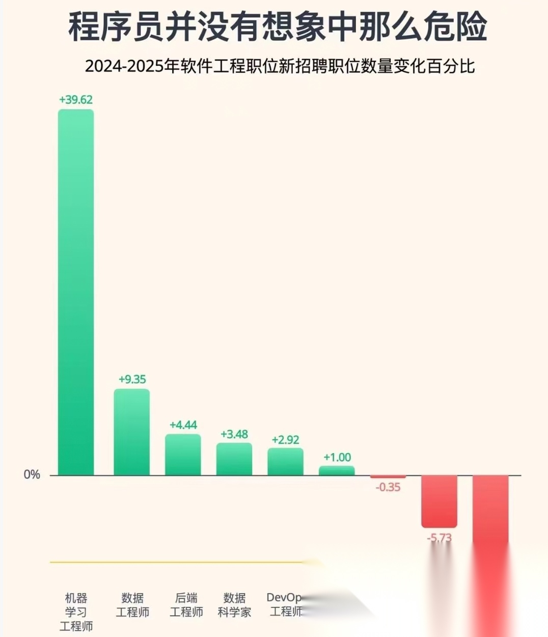 一张 2024-2025 年软件工程岗位招聘数据图,直接给这些说法 “泼了冷水”:机器学习工程师岗位暴涨 39.62%,数据工程师也涨了 9.35%,所谓 “全行业裁员” 根本是伪命题 —— 计算机就业不是 “不行了”,而是 “换赛道了”。