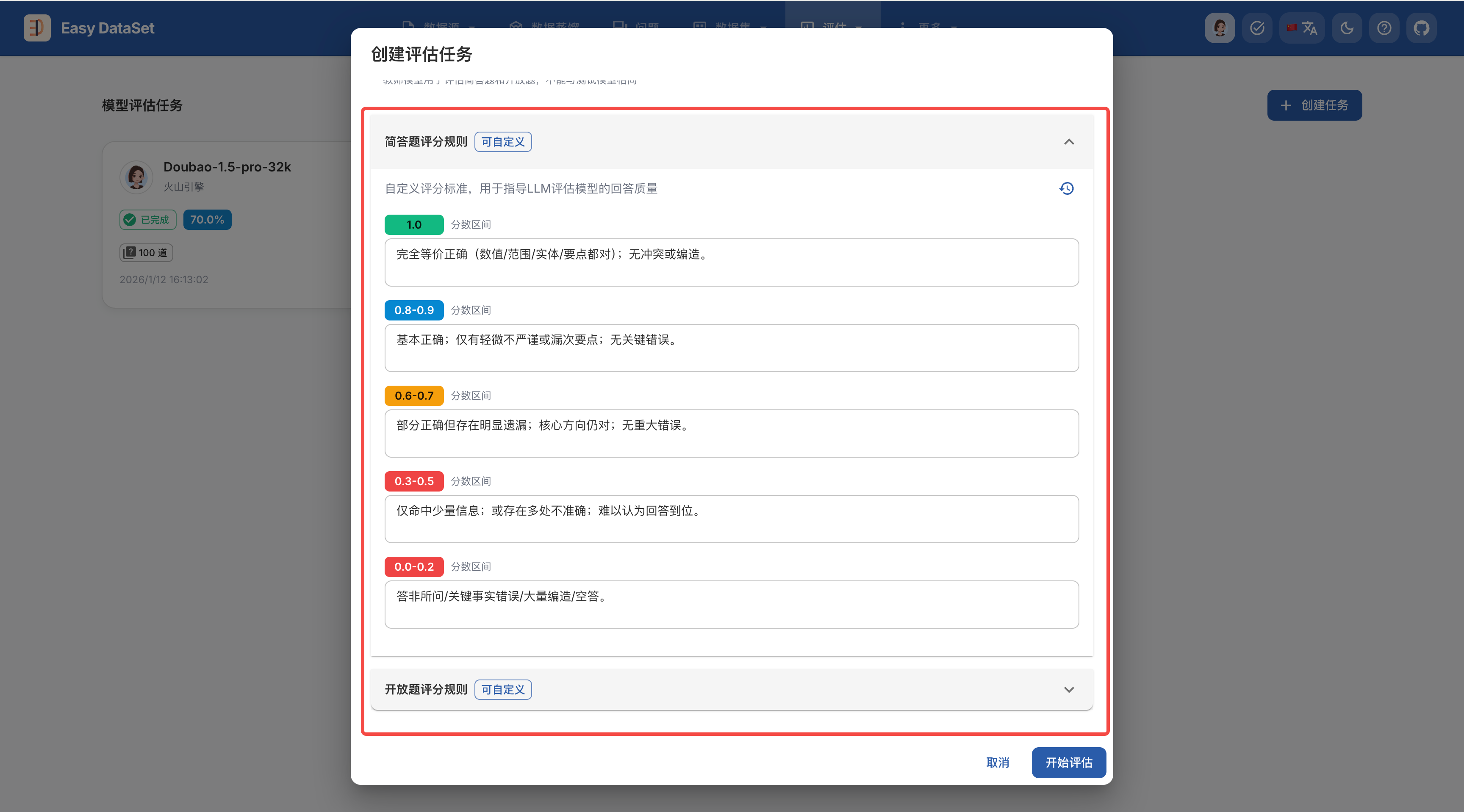 系统内置了一份评分标准,不过通用的标准比较宽泛,不一定适用于所有场景,如果你想得到更准确的评估结果,建议根据实际业务场景和数据集的特点定制具体的评分规则: