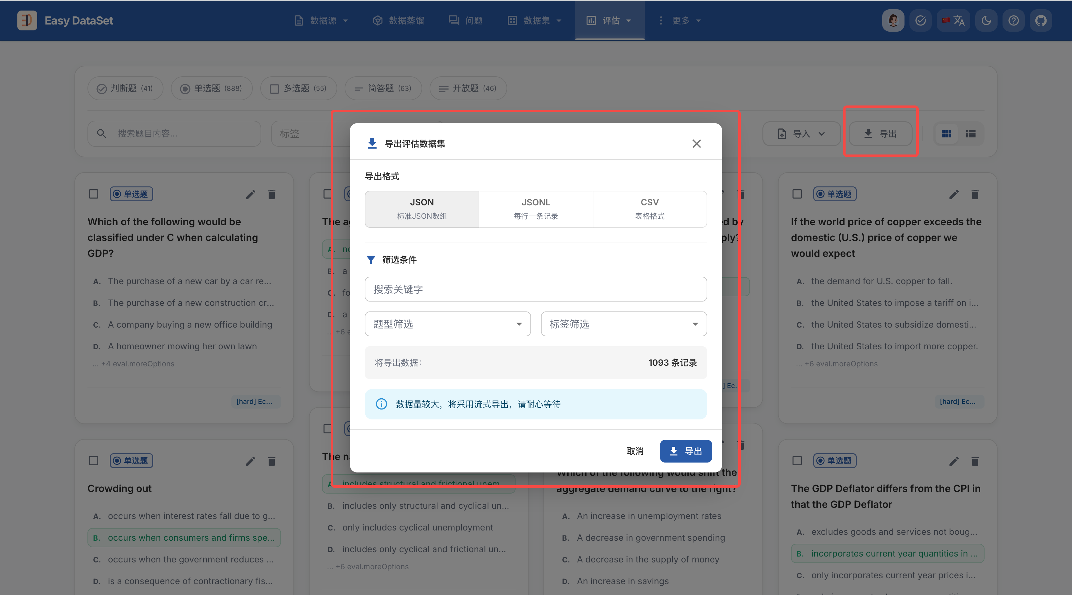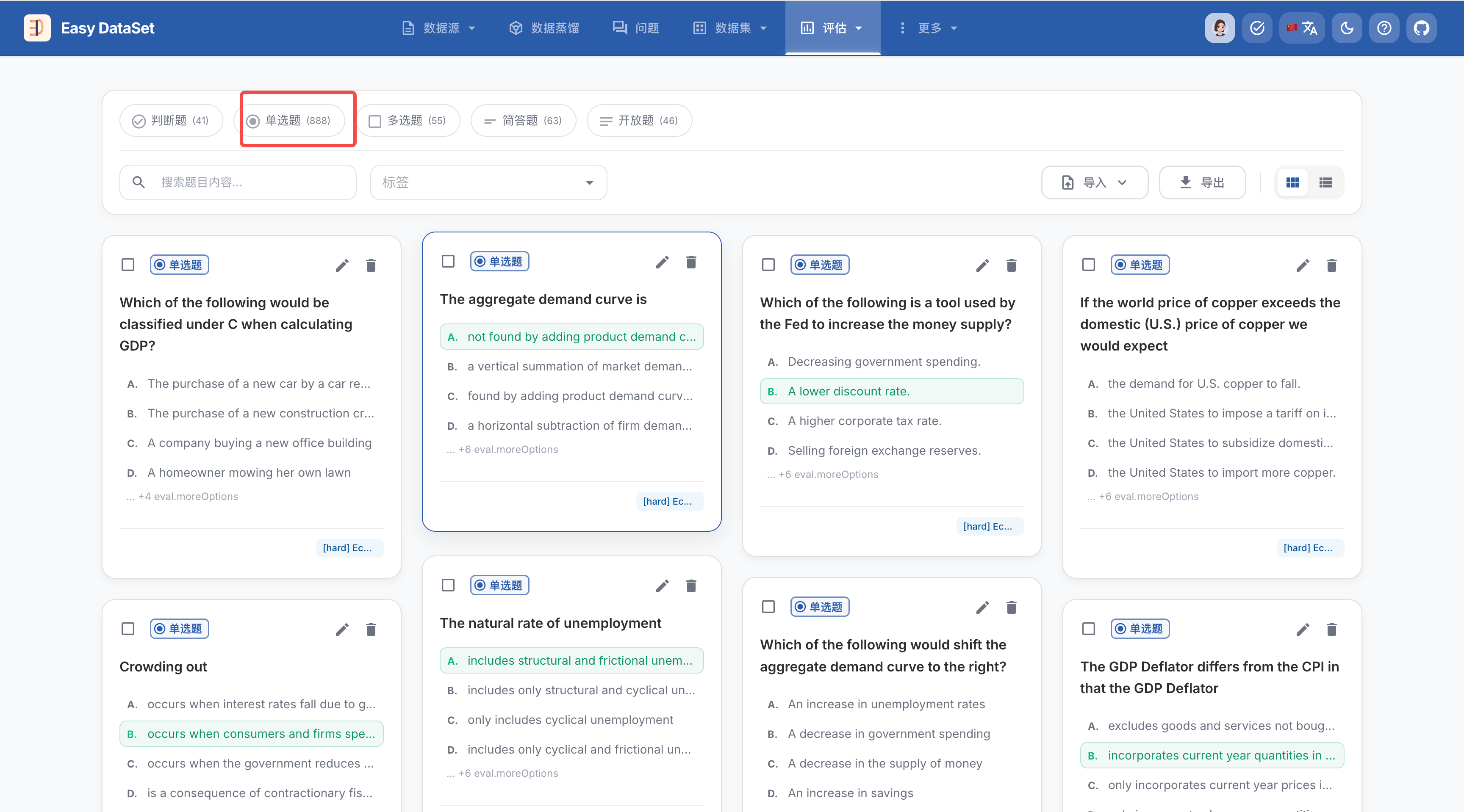 点击每个文本块上的 已生成测试题 标签,我们将跳转至【评估-评估数据集】模块,在这里你可以看到已经生成的所有数据集,你可以根据题目类型、题目内容和标签进行筛选: