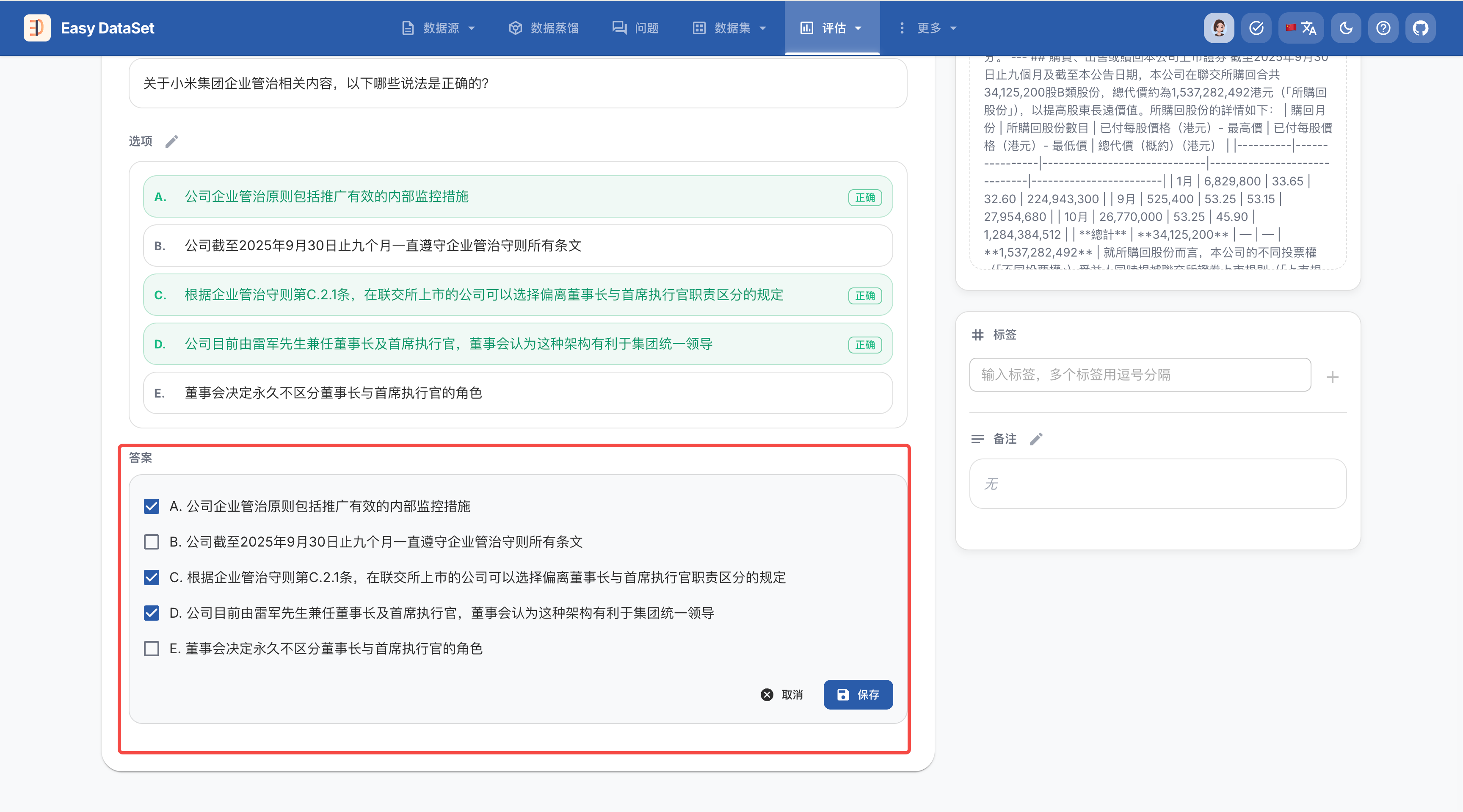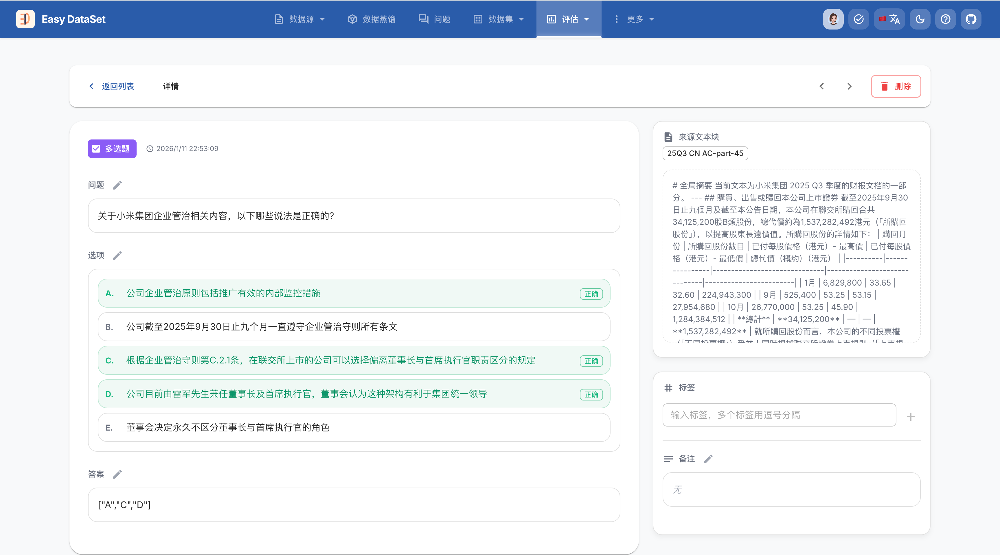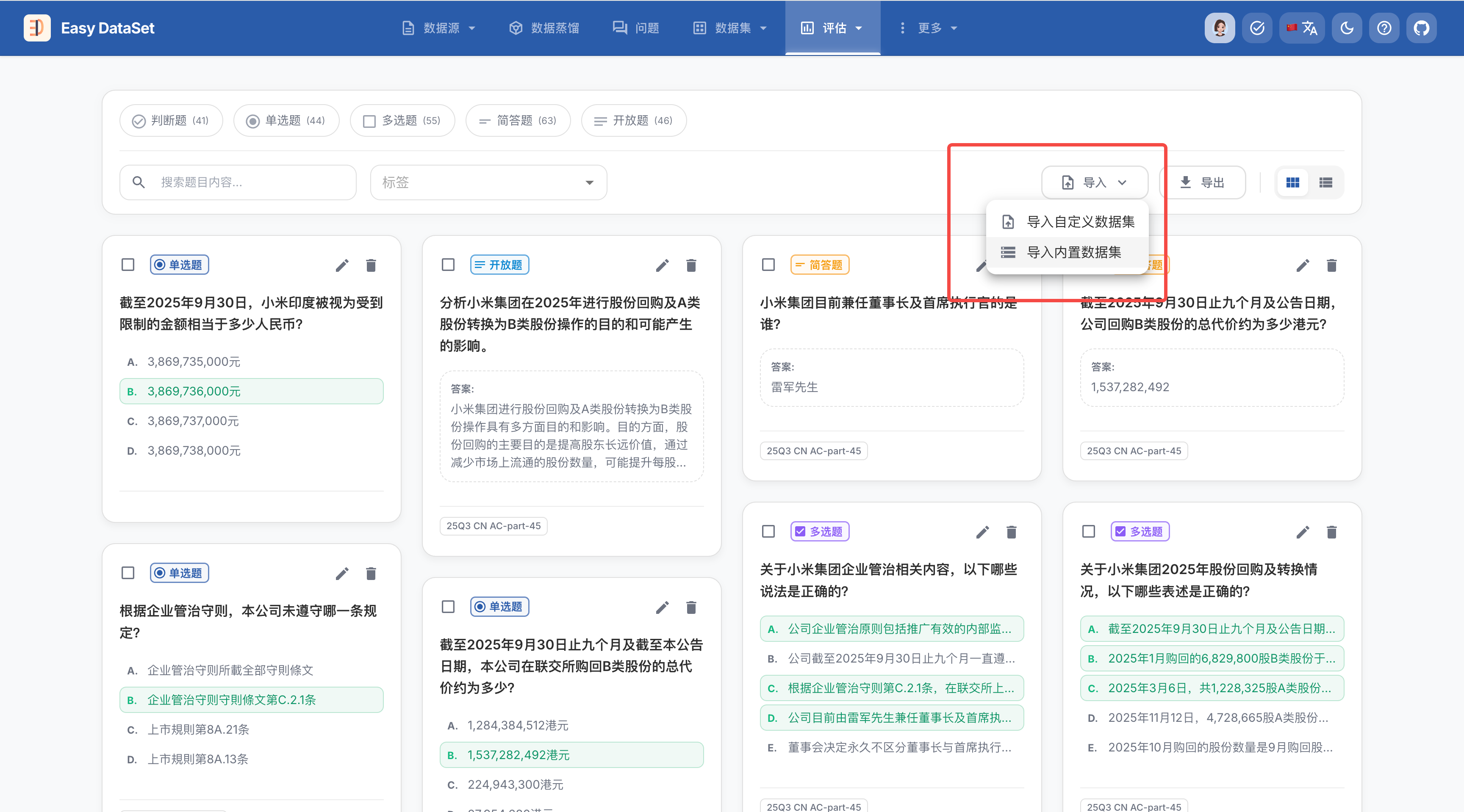 一个好的模型评估数据集(测试集)是衡量模型真实能力的基石。在 Easy Dataset 中,评估集不仅仅是问题的集合,更是包含标准答案、考点标签和业务逻辑的综合知识库。