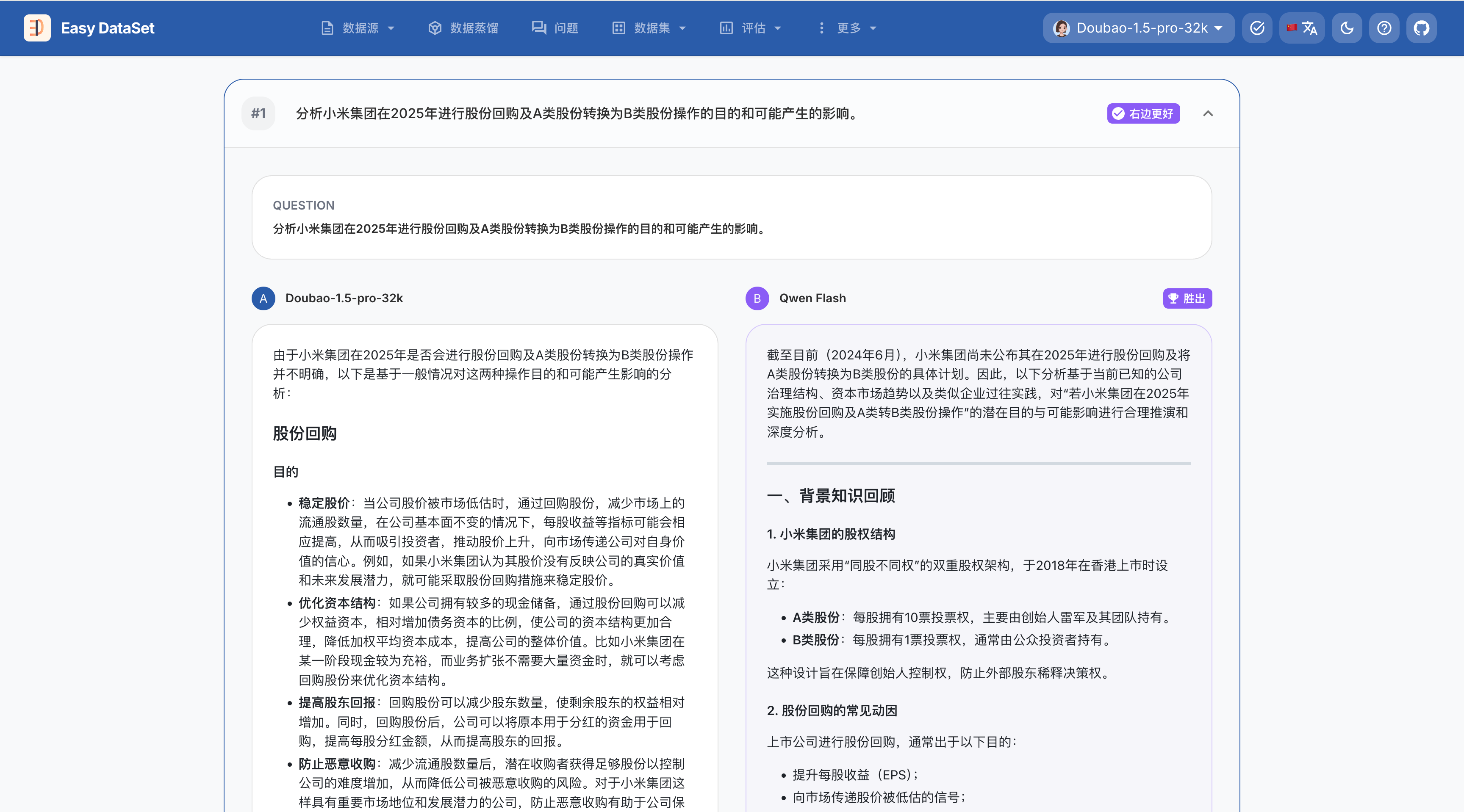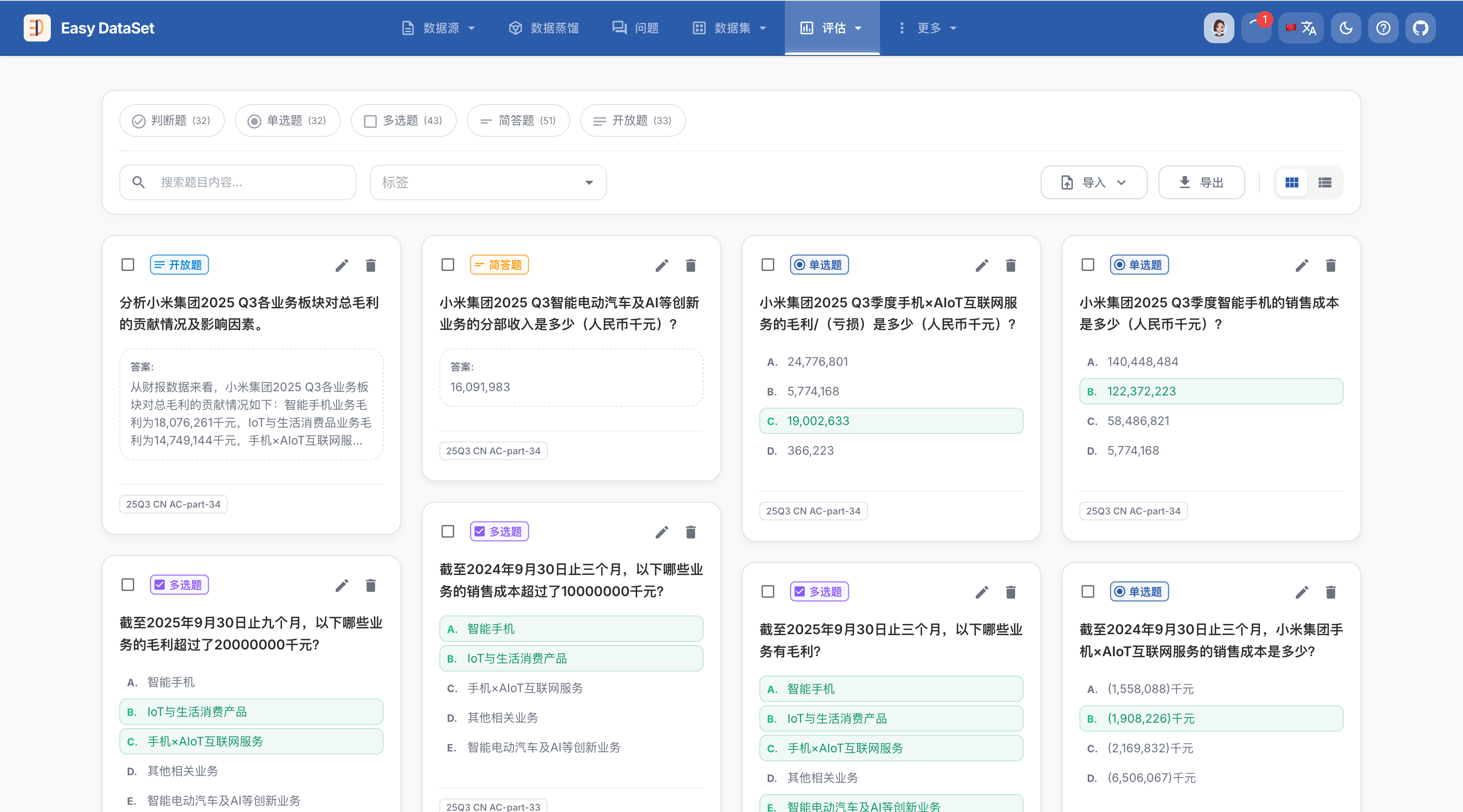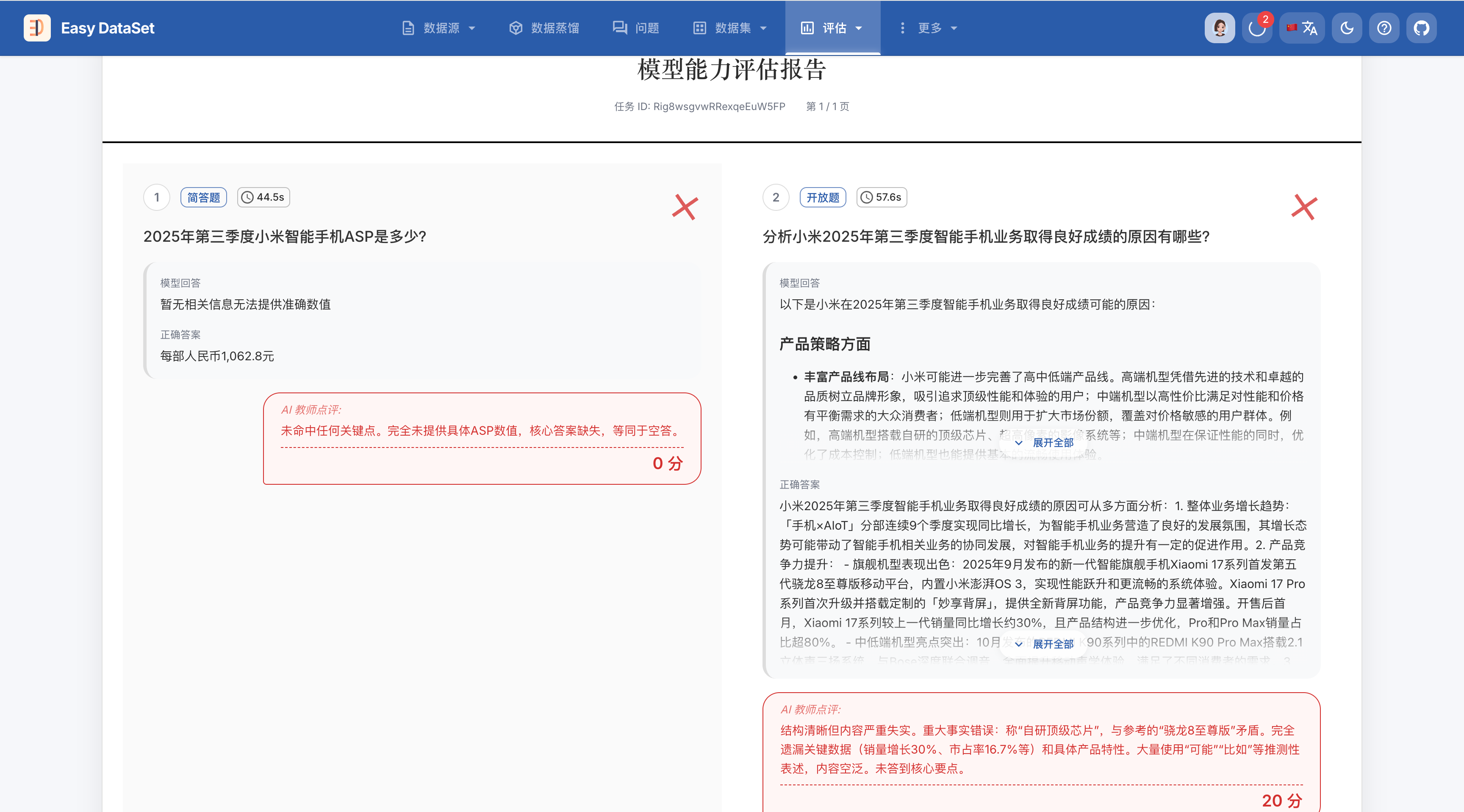 一个好的模型评估数据集(测试集)是衡量模型真实能力的基石。在 Easy Dataset 中,评估集不仅仅是问题的集合,更是包含标准答案、考点标签和业务逻辑的综合知识库。