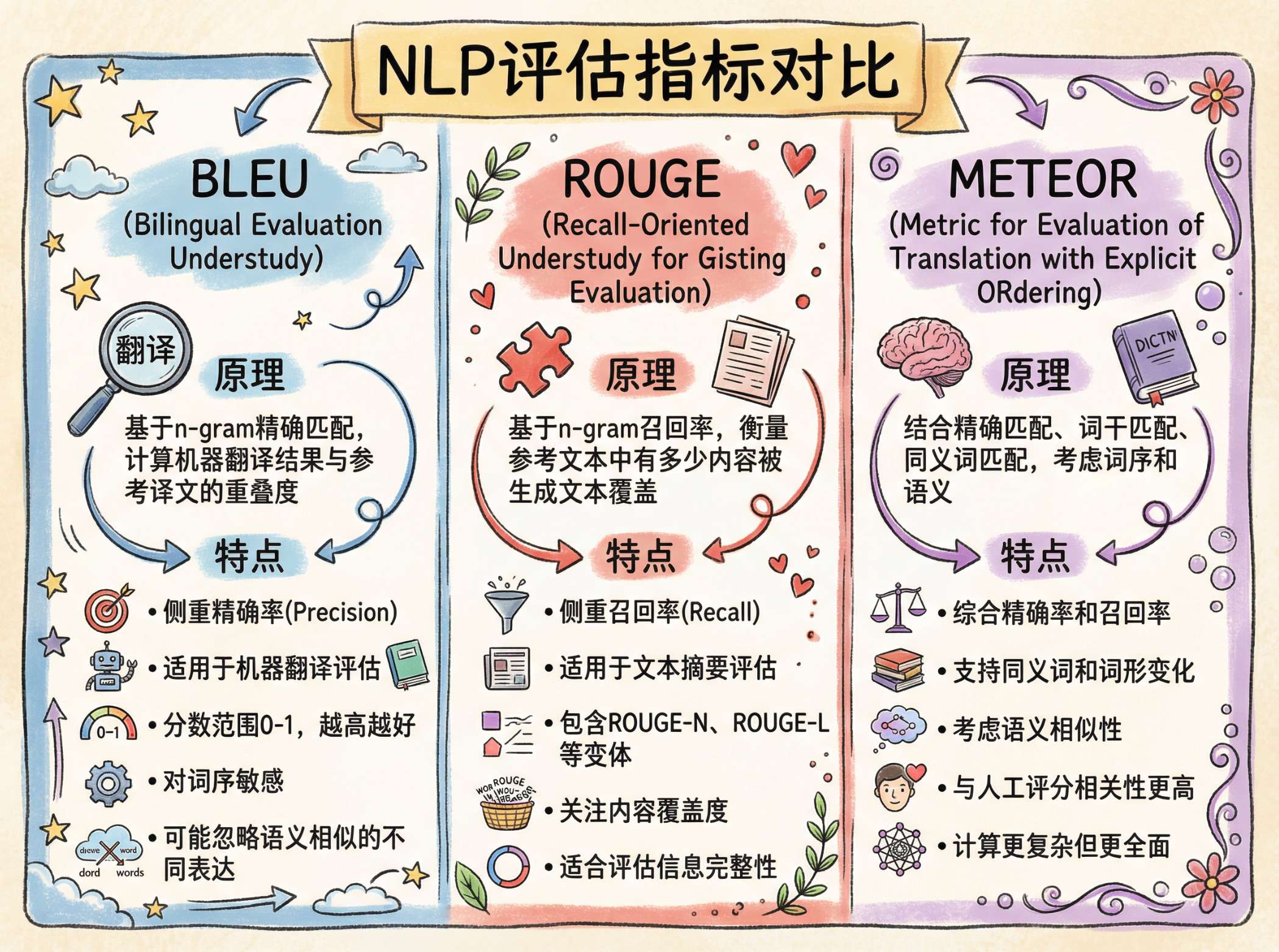 比如我们经常听到的 BLEU、ROUGE、METEOR 这些指标是自然语言处理(NLP)领域最常用的自动文本生成评估指标,核心作用是量化机器生成文本(如翻译、摘要、对话回复)与人工标注的参考文本之间的相似度,判断生成结果的质量。