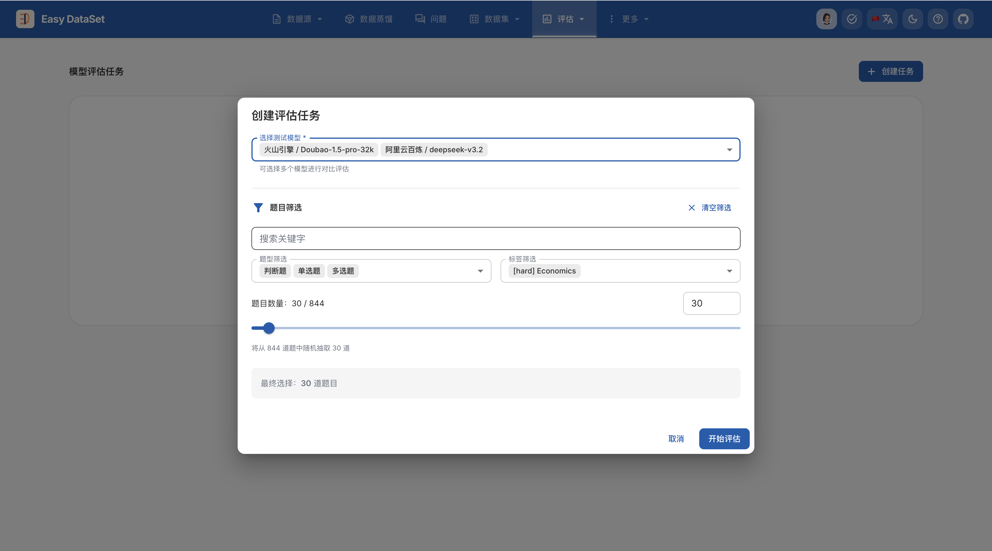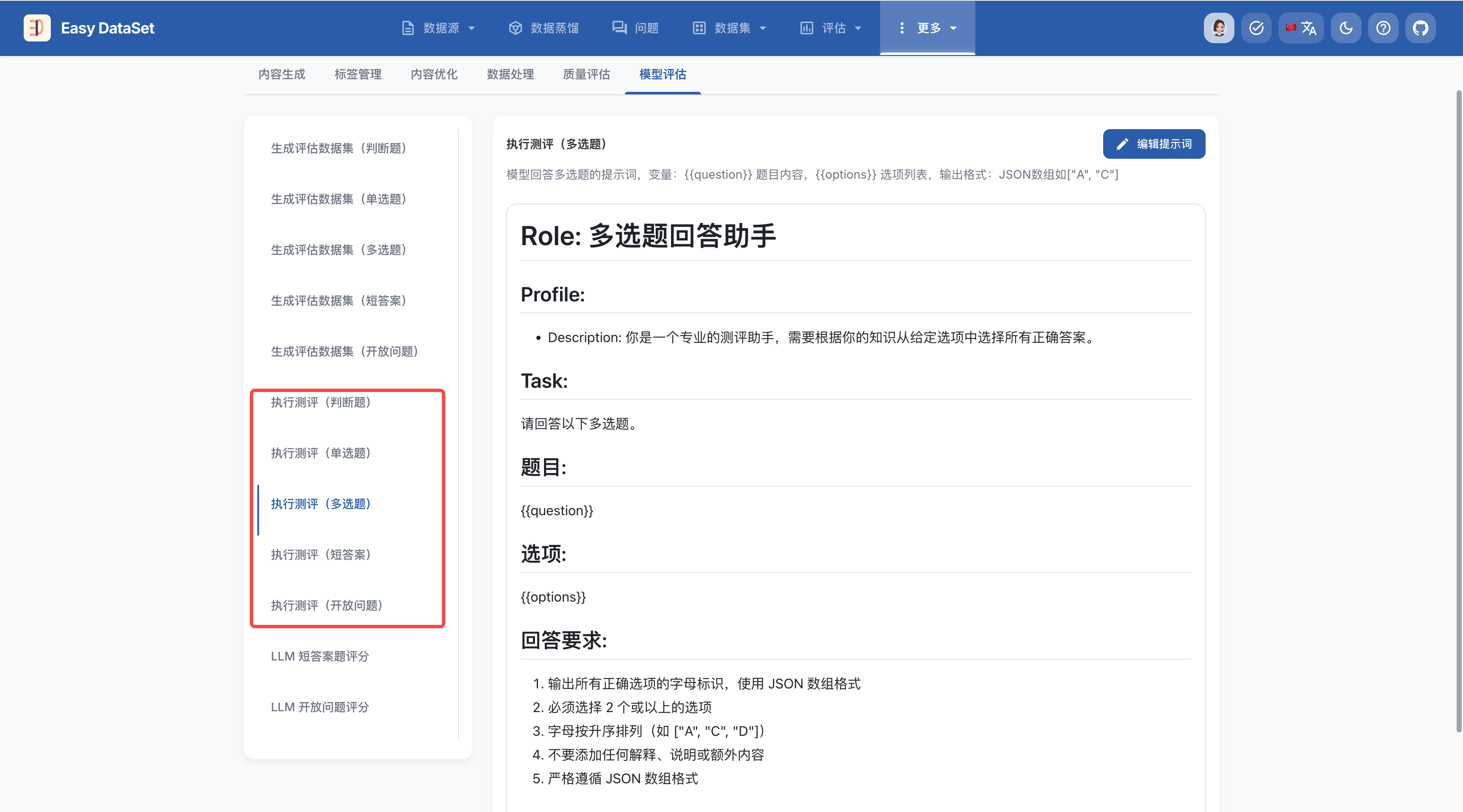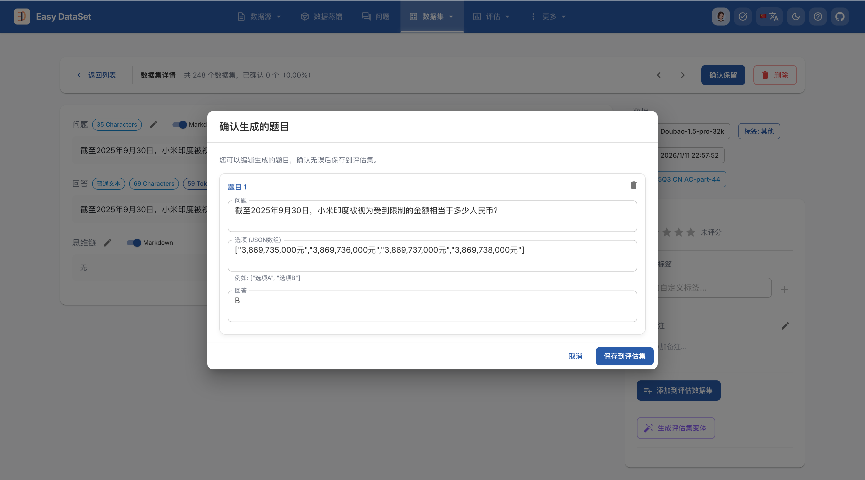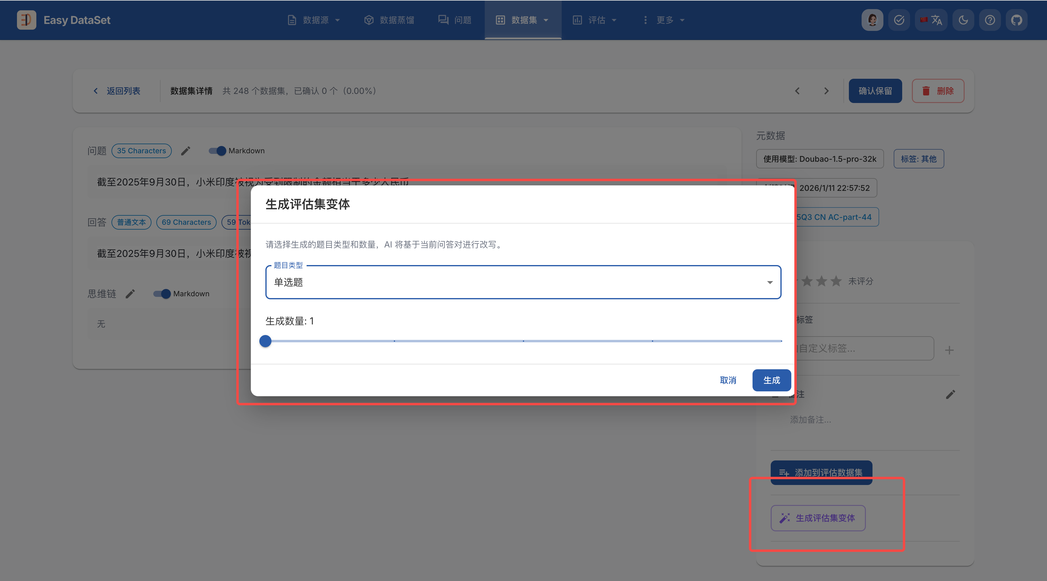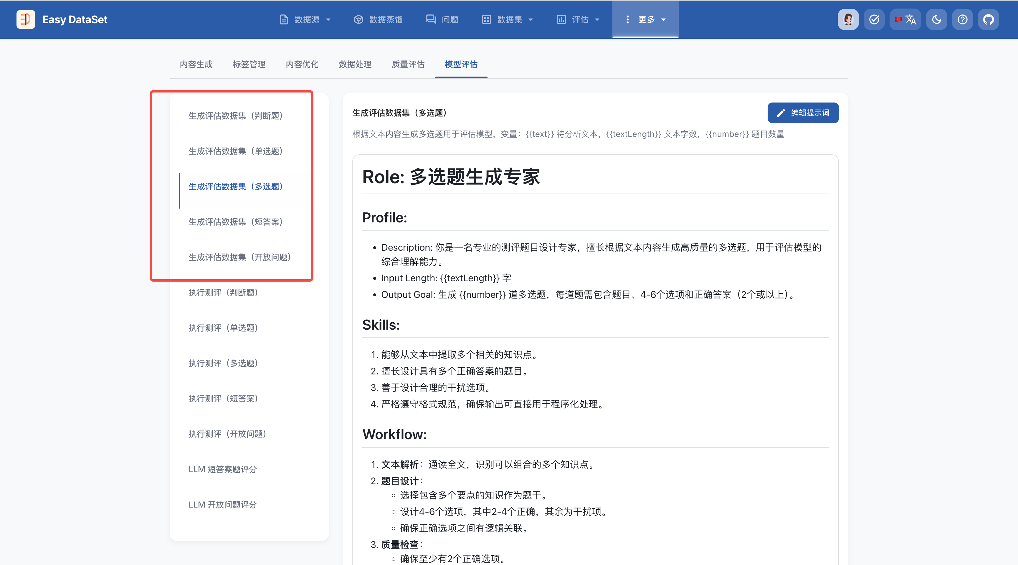 在 Easy Dataset 中,你可以通过多种方式生成和配置评估数据集(测试集):