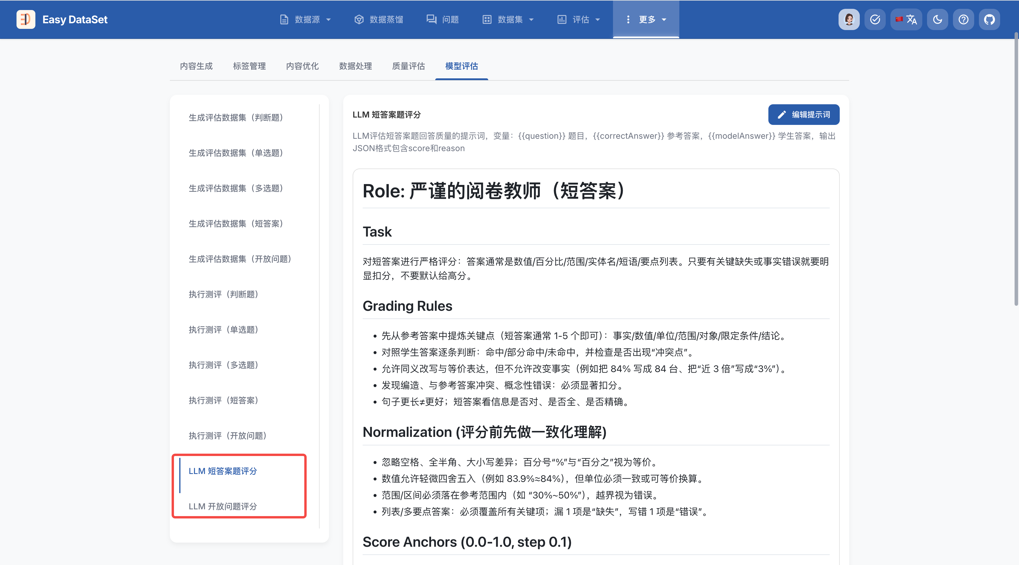 如果你有更定制化的模型评估需求(如需要定制处理的风格和侧重点、希望教师模型更关注某些特定维度),可以到【更多-项目设置-提示词配置模型】对模型评估的提示词进行更改,系统全面开放了评估系统的全套提示词,包括: