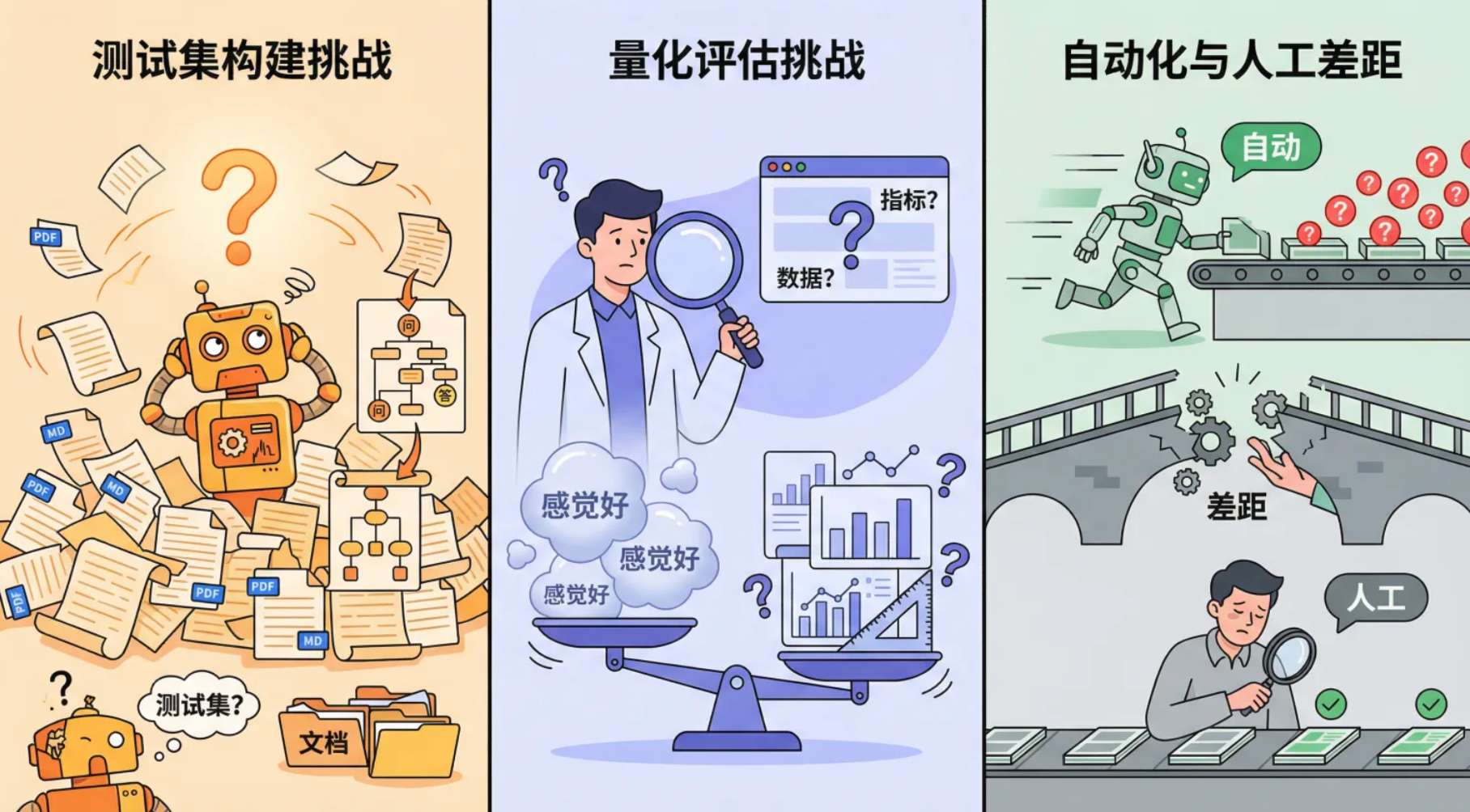 测试集难构造:和模型微调训练面临的问题一样,企业里有海量的 PDF 手册、Markdown 技术文档,但没有现成的 QA 对(问答对)。要评估模型,首先得把非结构化的文档变成结构化的测试集。
