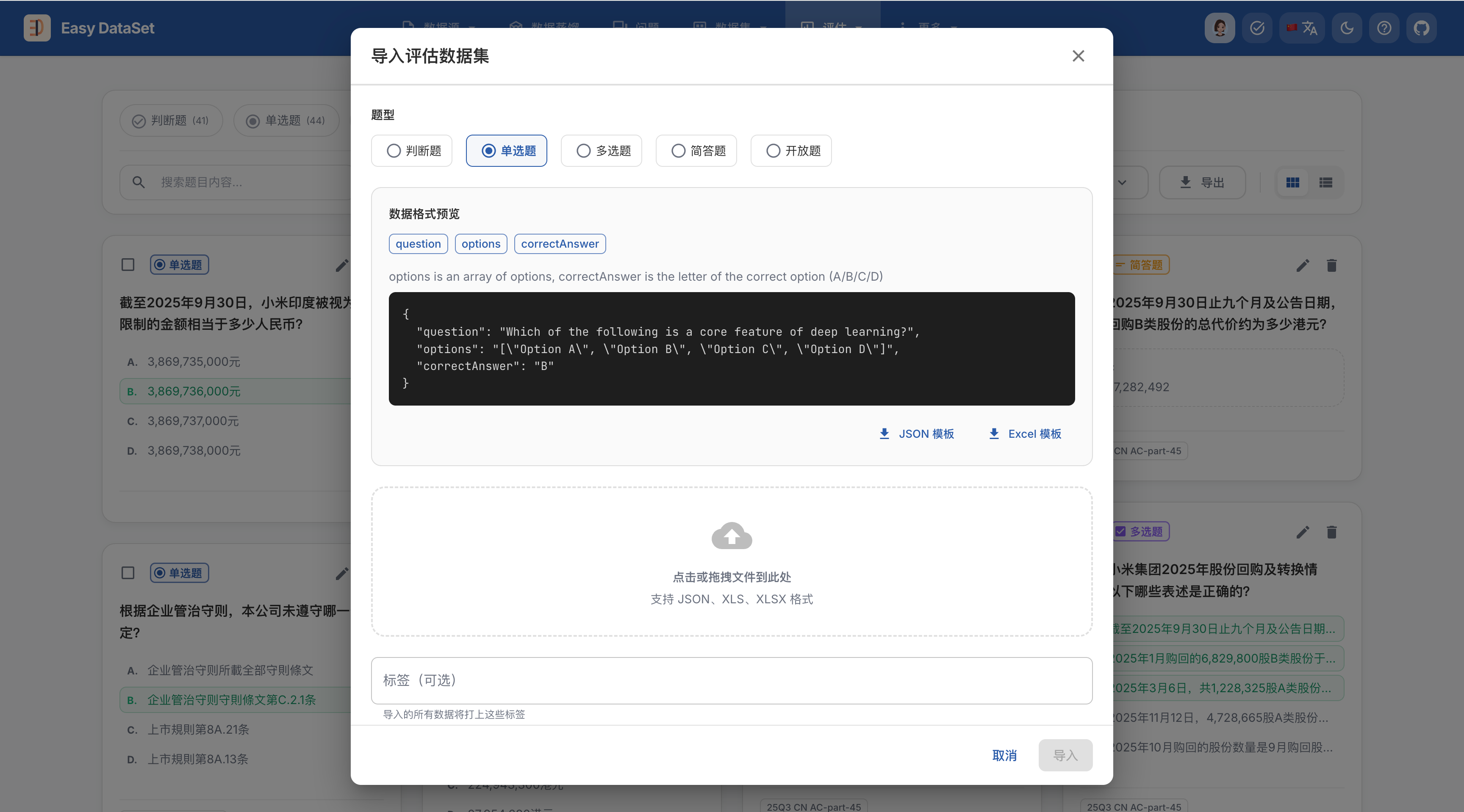 如果你已经有准备好的测试集,只是想使用 Easy Dataset 来做评估任务,可以到【评估-评估数据集】模块直接进行导入: