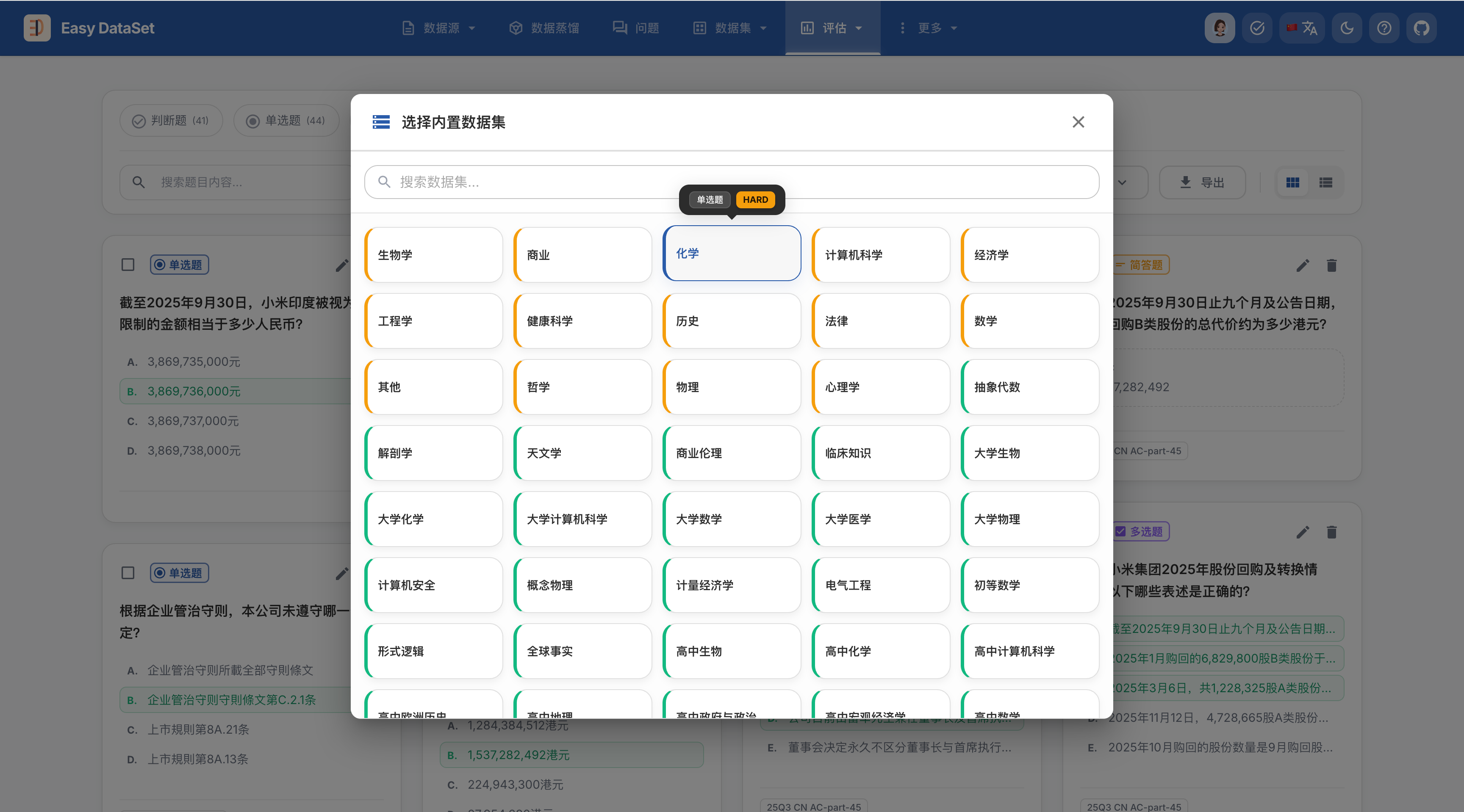 另外,平台还内置了丰富的领域知识数据集,如果你想测试模型在特定领域下的表现,可以直接选择【导入内置数据集】并选择对应学科进行导入: