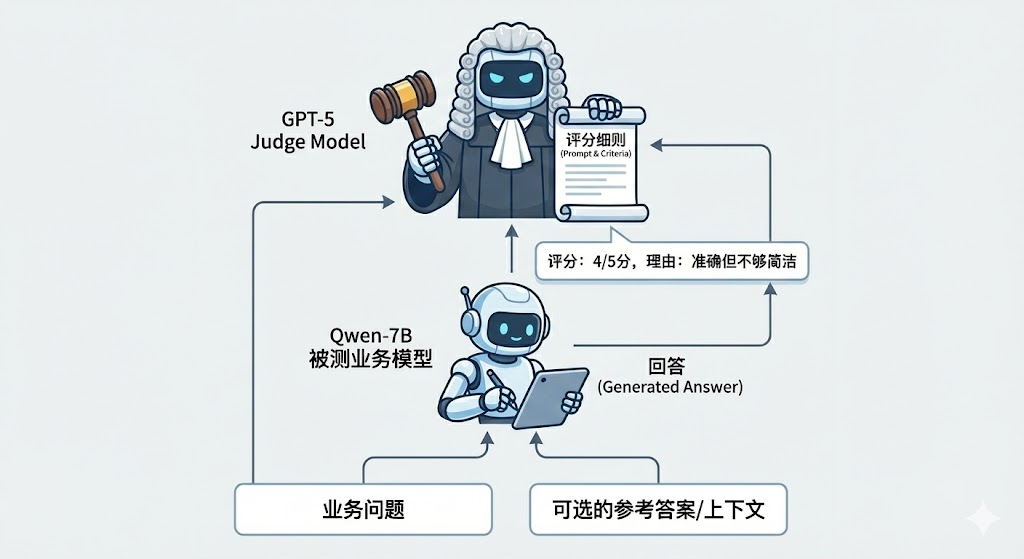 核心逻辑:用一个更强、更聪明的模型(比如 GPT-5)当裁判,去给业务模型(比如 Qwen3-7B 的小模型)打分。
