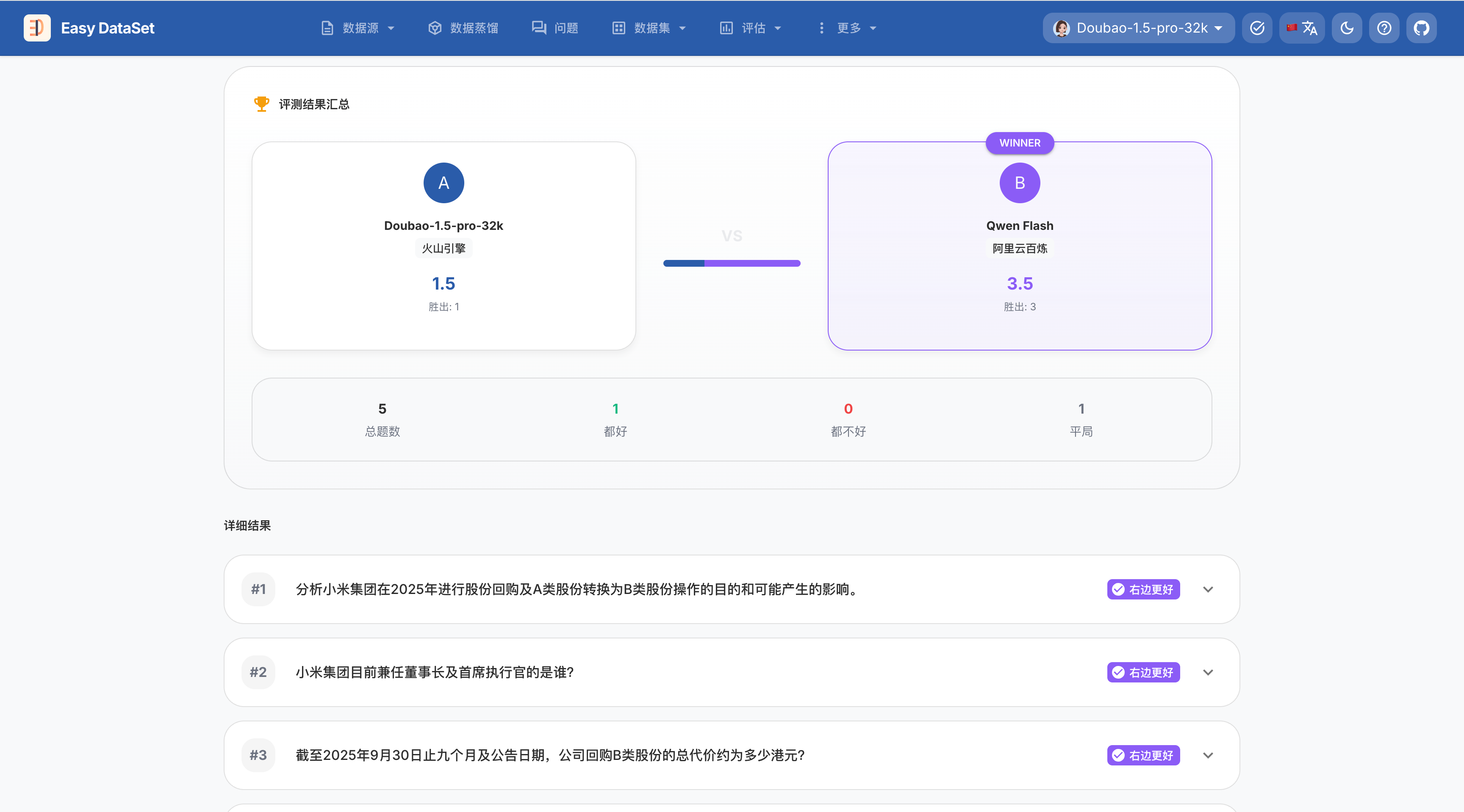 在,Easy Dataset 的 1.7.0 版本,支持了全新的 “评估” 模块,能够做到 自动化生成测试集 + 低成本的创建评估任务 + 可视化的评估结果。
