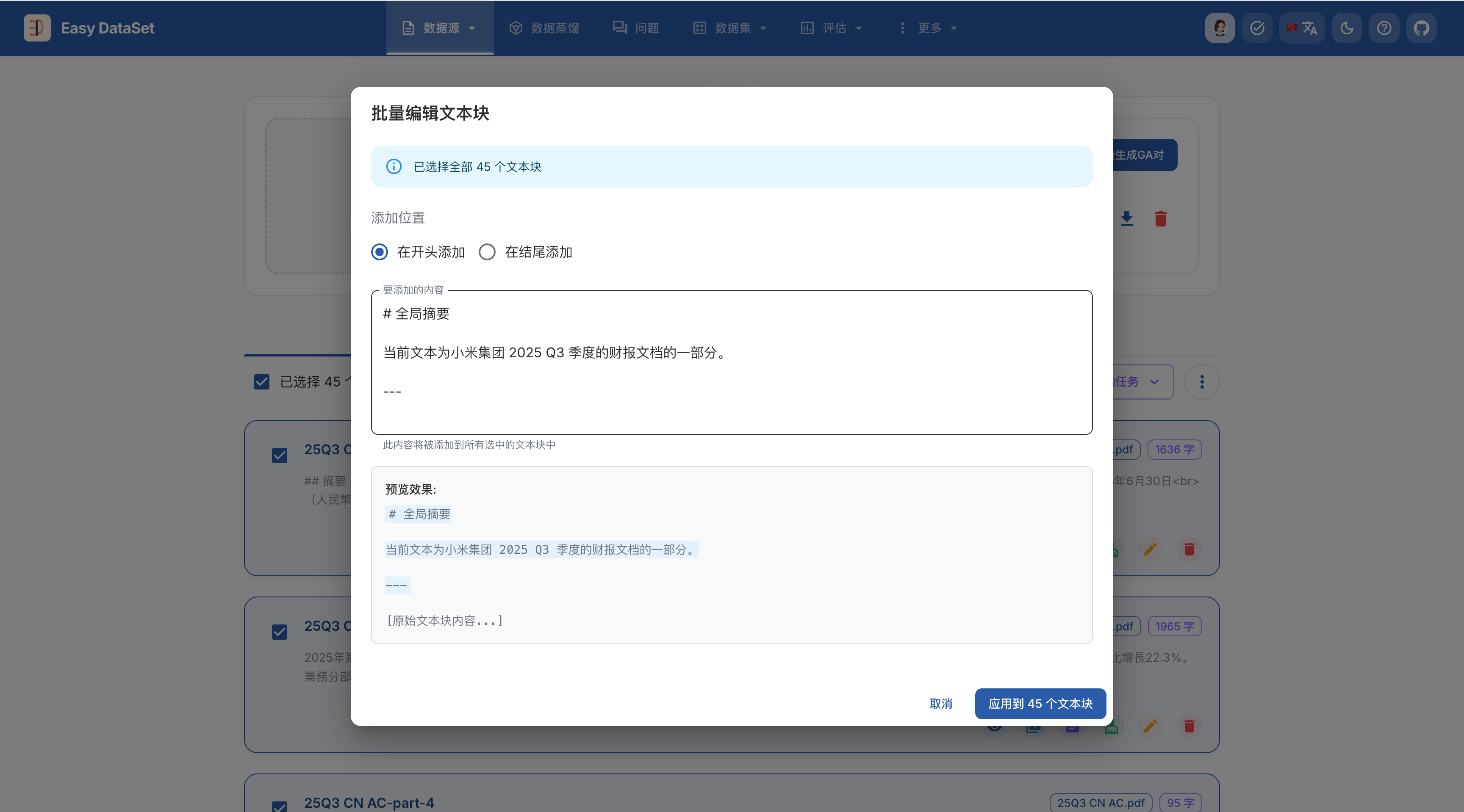 系统解析完成后,会对文档进行自动切块,为了保证后续在文本块上生成的测试集更符合主题,我们批量编辑文本块: