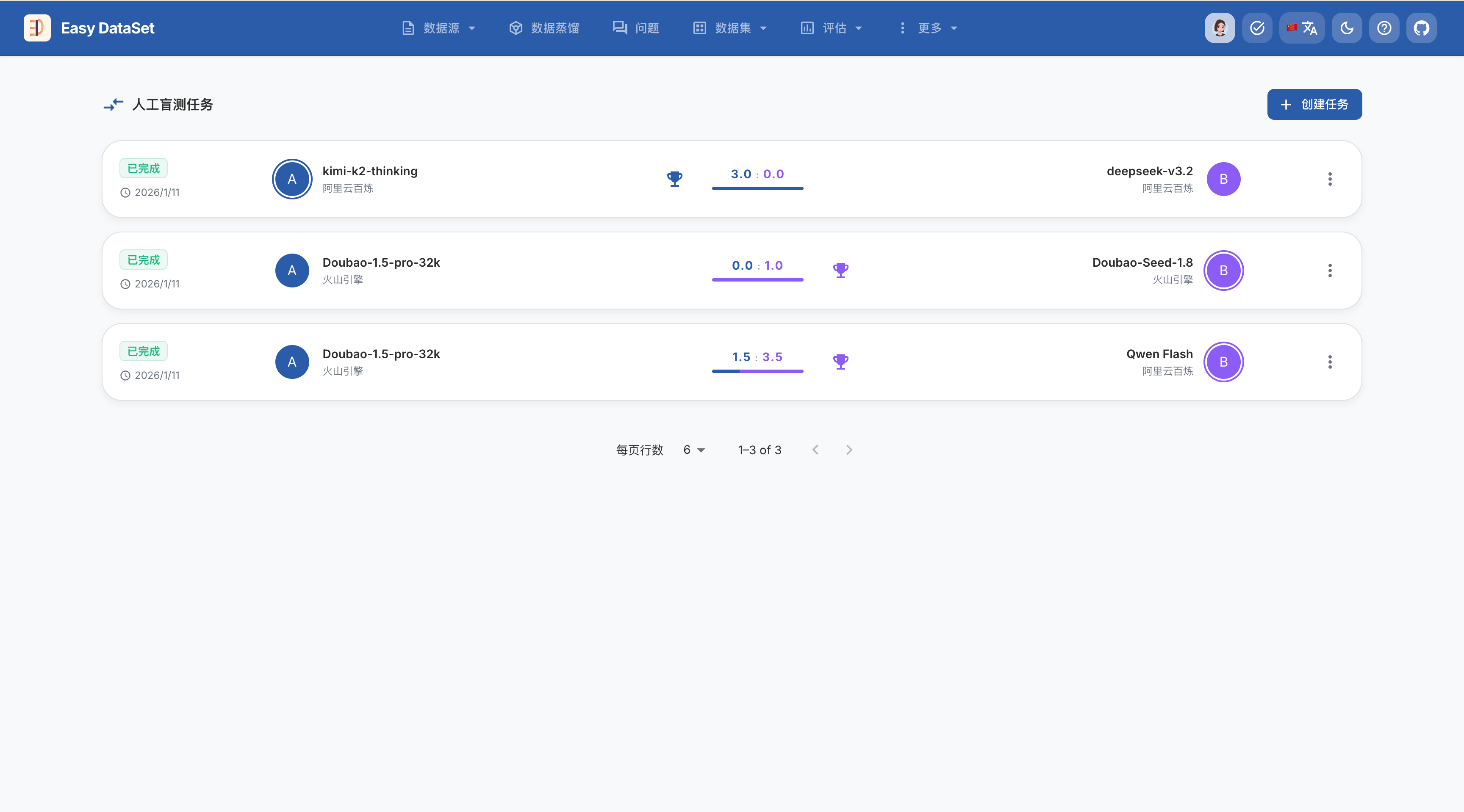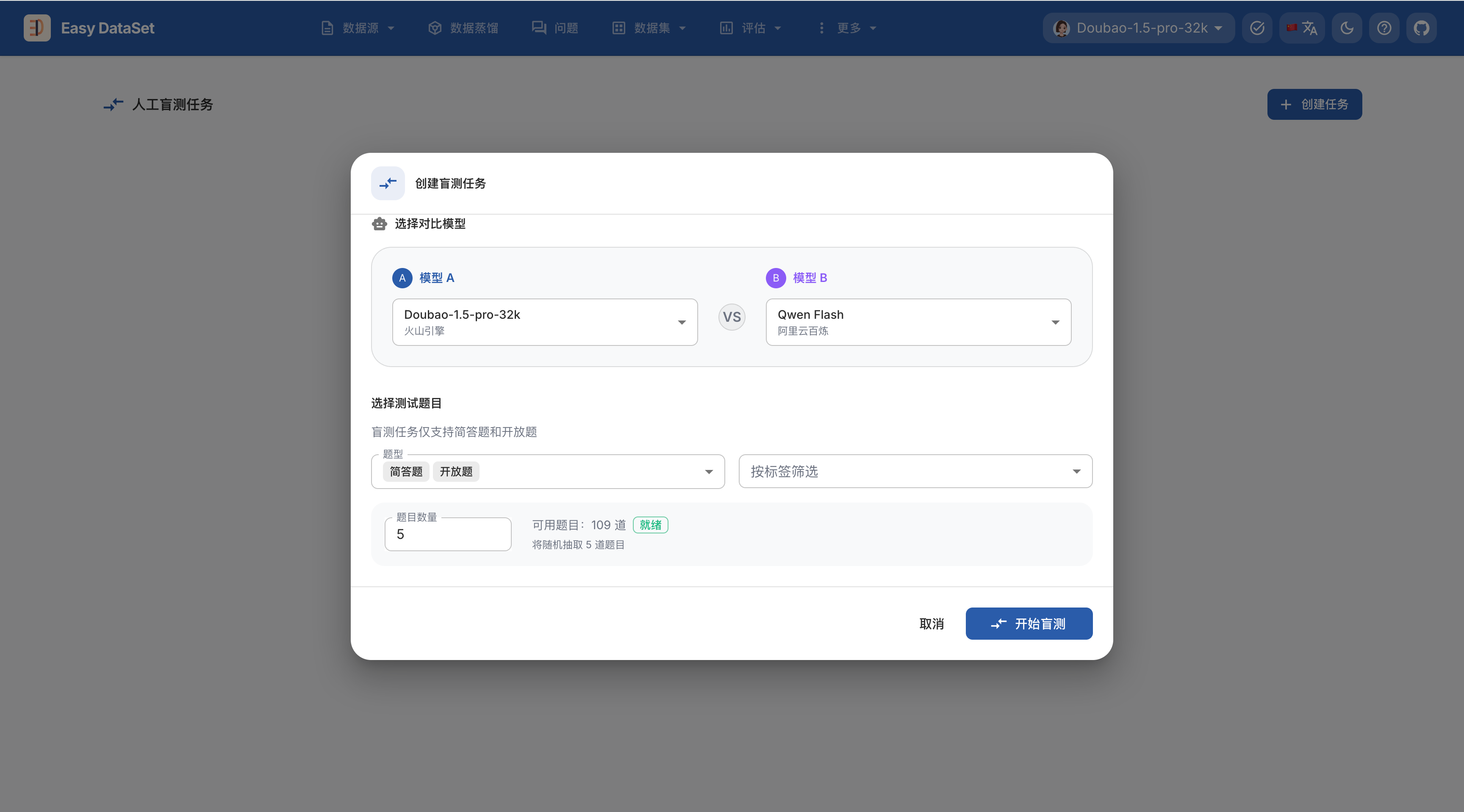 我们来到【评估-人工盲测任务】模块,然后点击创建任务,然后配置: