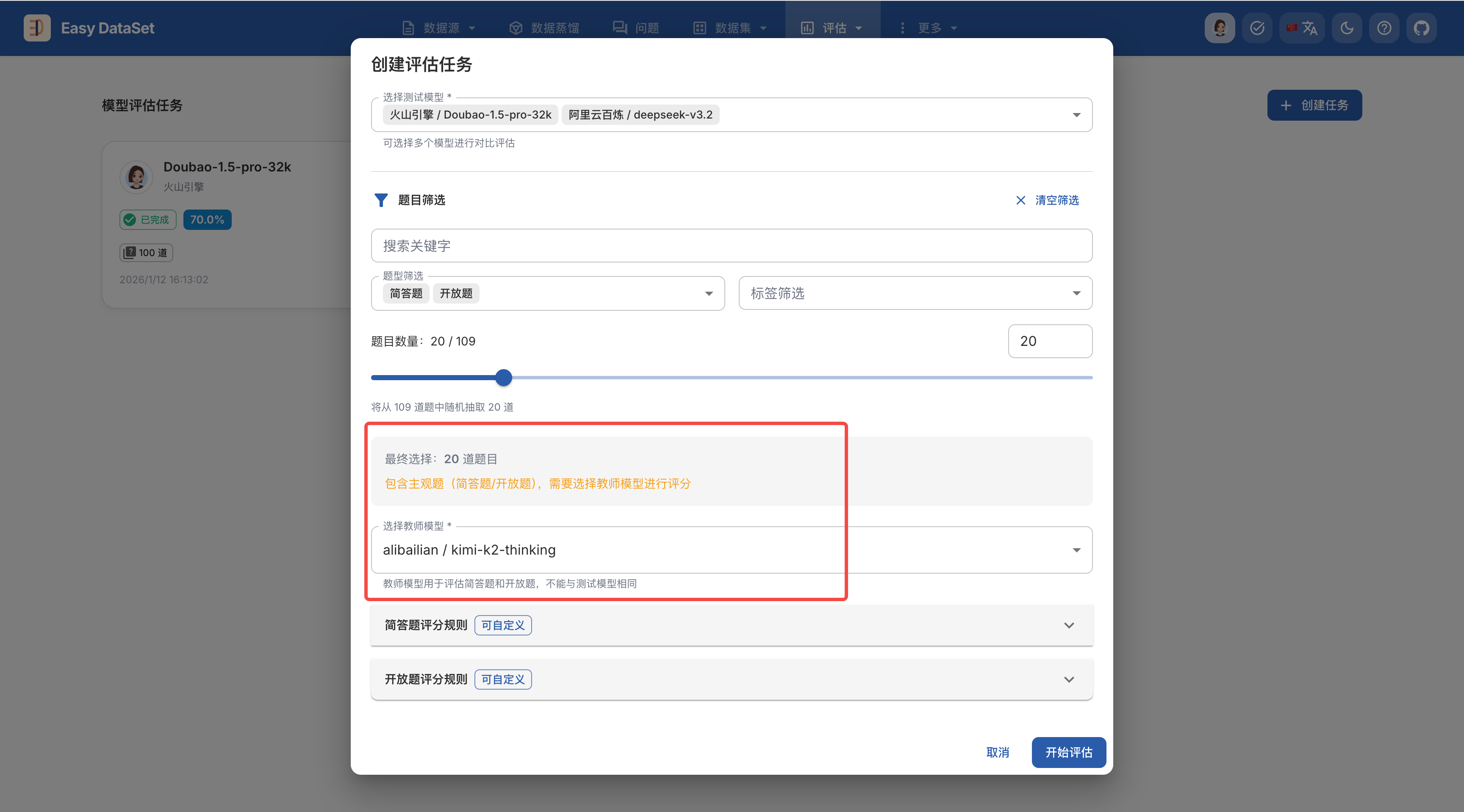 就像要真实要对模型进行一场考试一样,我们可以配置本次 “考卷” 的具体题目范围:
