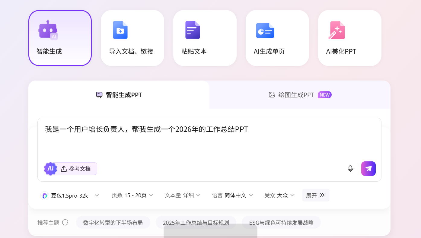 你可以直接把你的身份告诉 AI ,让它帮你直接生成一个工作汇报 PPT ,比如“我是一个用户增长负责人,帮我生成一个2026年的工作总结PPT”