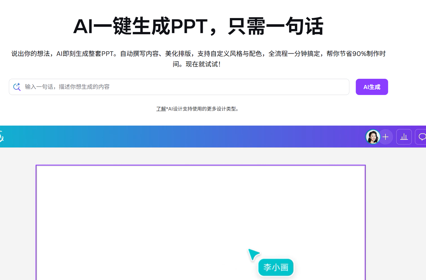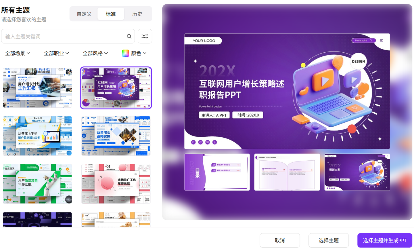 - 全流程AI驱动:输入主题或关键词就能自动生成完整PPT框架,智能匹配内容布局和设计风格,无需手动进行基础排版。对于不擅长设计的职场人来说,这一功能能大幅降低制作难度,配合工作汇报PPT模板网站的优质模板,能快速产出专业级PPT。