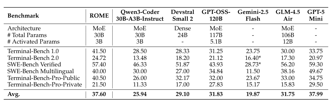 该表格在Terminal-Bench 1.0/2.0、SWE-Bench Verified、SWE-Bench Multilingual与Terminal-Bench-Pro-Public/Private五类智能体任务基准上,系统对比了ROME与六款代表性模型的端到端解决能力,结果显示:尽管ROME仅以30B总参数、3B激活参数的轻量级MoE结构参赛,其在最具挑战的SWE-Bench Verified上取得57.40分,仅次于GPT-5的59.30分,且平均得分37.60位列榜眼,仅次于GPT-5的37.99,验证了在参数效率与任务泛化性之间实现最优权衡的ALE训练范式可使中小规模模型在真实软件工程环境中逼近甚至超越超大 dense 模型的代理性能。