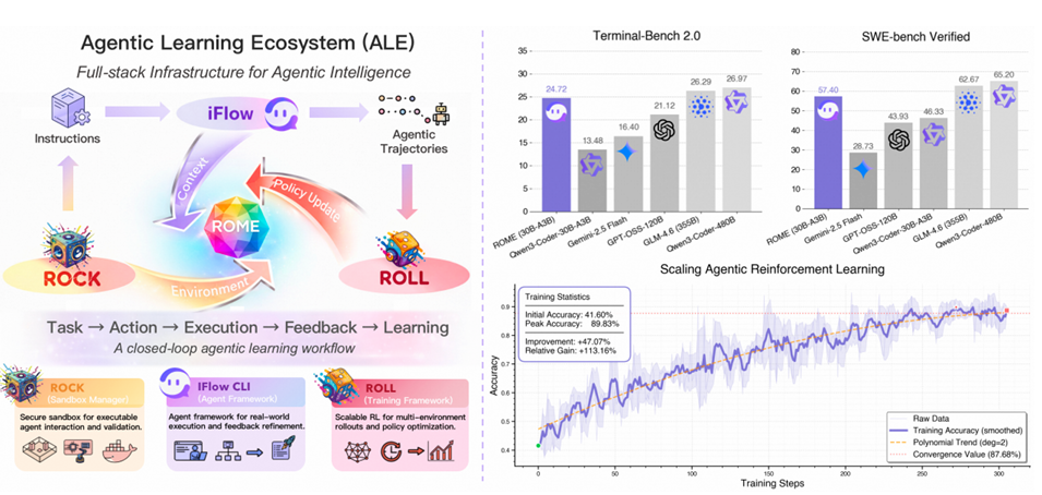 本图系统展示了面向智能体智能的全栈基础设施ALE在构建、训练与评估智能体模型过程中的关键性能指标与训练动态变化。左侧柱状图对比了ROME模型在Terminal-Bench 2.0与SWE-bench Verified基准上的性能表现,验证了ALE框架在提升智能体任务解决能力方面的有效性;中间部分通过“任务→动作→执行→反馈→学习”的闭环流程图,初始准确率为41.60%,经持续策略优化后峰值达到89.83%,整体提升47.07%,相对增益达113.16%,并通过二次多项式拟合揭示其收敛趋势,最终收敛值稳定于87.68%,充分验证了ALE基础设施在扩展智能体强化学习过程中的稳定性与高效性。