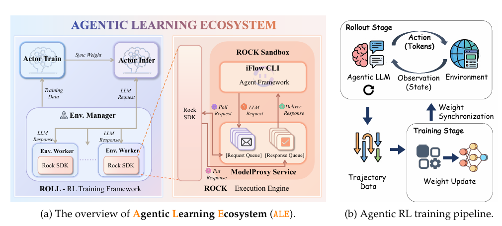 本图从系统视角阐释了智能体学习生态系统(ALE)的双阶段协同机制:图(a)以分层架构形式展示了由ROLL-RL训练框架、ROCK执行引擎与iFlow CLI智能体框架构成的全栈基础设施,其中ROCK沙盒环境通过SDK与请求/响应队列实现与多环境工作节点的异步交互,Actor模型在训练与推理角色间切换,权重同步模块保障分布式训练一致性,形成“状态→动作→观测→反馈”的闭环数据流;图(b)进一步细化强化学习训练管线,揭示ALE如何通过Rollout阶段在ROCK环境中生成高多样性交互轨迹,并在Training阶段利用ROLL框架对智能体LLM进行策略梯度优化,实现从环境交互到权重更新的端到端可扩展强化学习迭代,最终支持百万级轨迹规模下的稳定收敛与能力涌现。