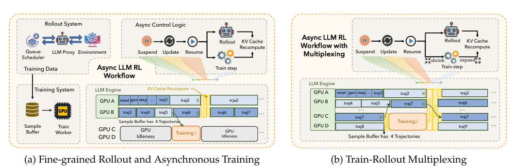 本图揭示了在大规模异步强化学习系统中,通过细粒度 rollout 与训练阶段的多路复用调度实现 GPU 资源极致利用与样本吞吐最大化的核心机制:图(a) 以时空交错方式刻画了 Rollout System 与 Training System 的异步协同流程避免 GPU 空转;图(b) 进一步在同一 GPU 设备内展开 Train-Rollout Multiplexing 时序,展示 GPU A–D 上的 traj1–traj9 如何在 reset、gen、sample、train 等微任务间动态切换,利用细粒度调度器将生成、采样与参数更新步骤拆解为可抢占的微操作,从而在单卡内实现“rollout 产生轨迹→缓存→训练消费”的流水线并行,使得 rollout 与训练在时空维度重叠运行,显著降低端到端迭代延迟并提升系统整体吞吐量。