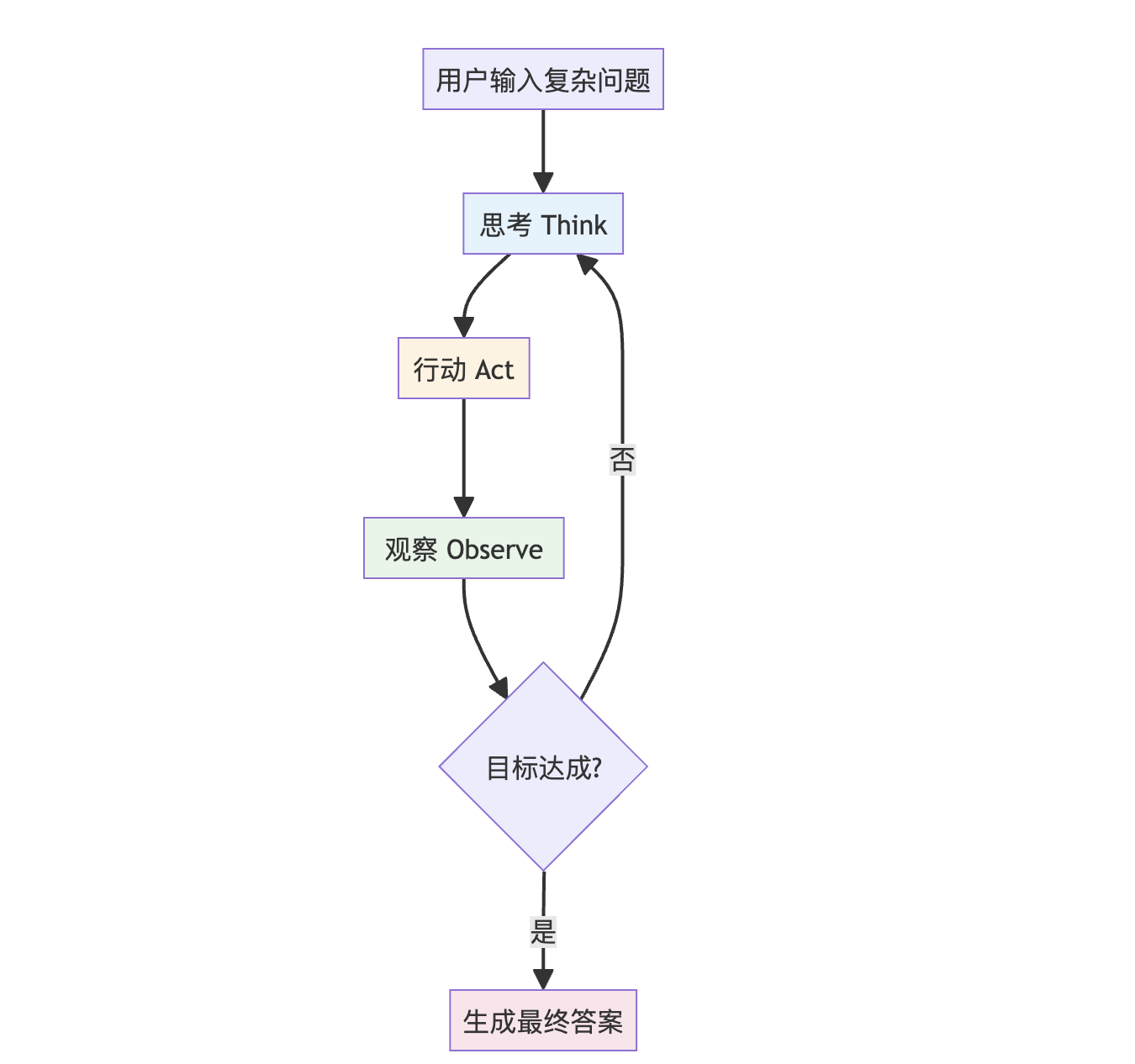 ReAct 的精髓在于循环。智能体不会在一次工具调用后就停止,而是会将观察结果纳入上下文,生成新的思考,决定下一步行动。这种"反复横跳"使其能够解决需要多步依赖的复杂问题。