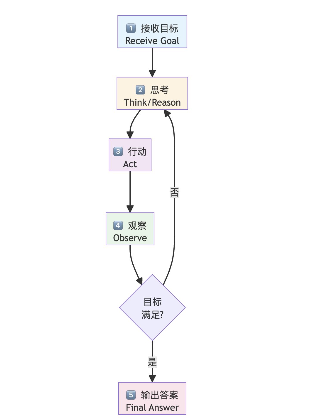 ReAct 架构遵循 "接收目标 → 思考 → 行动 → 观察 → 循环" 的核心流程: