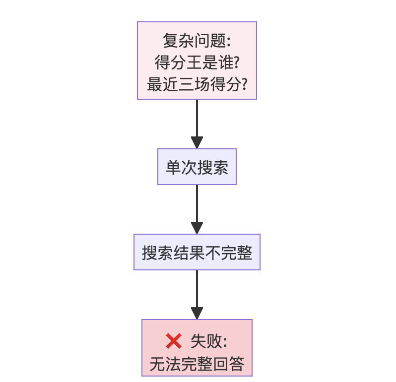 "justification": "基础Agent只进行了一次搜索,无法获取完整信息。它无法分解问题,导致最终答案不完整或错误。推理过程存在明显缺陷,缺乏迭代思考能力。"