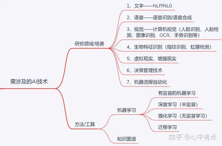 以下是AI产品经理涉及到的AI技术,并不是说每个技术都非常熟悉,也不是要对算法细节精通。而是根据自己涉及的领域从单点向外辐射,了解各算法、模型的使用场景及其优劣势,逐渐丰富AI技术体系。