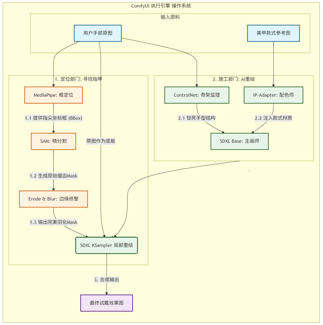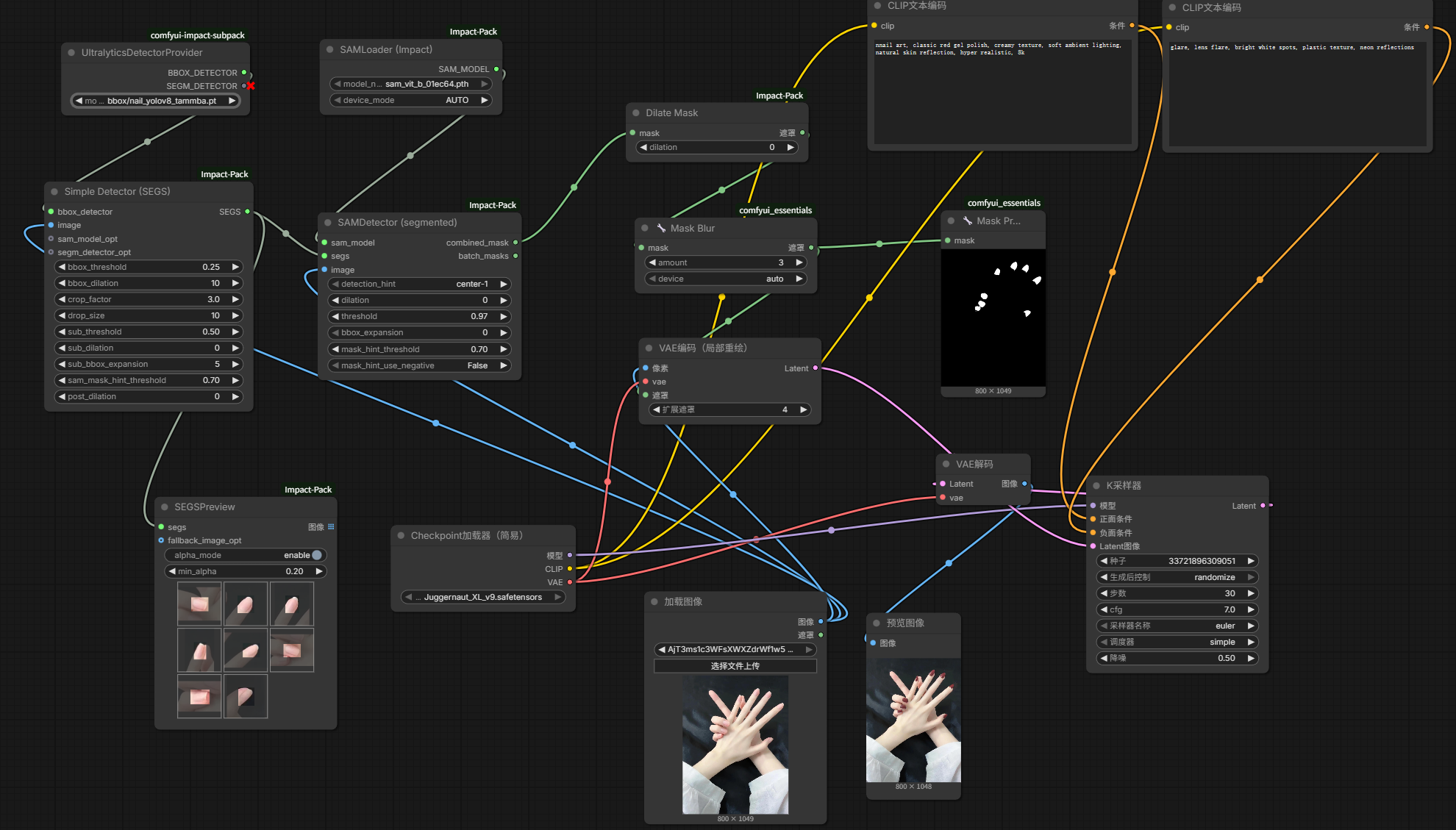 接下来将在ComfyUI中像搭积木一样构建出“指尖魔镜”的核心算法流水线。我们目前的达成目标是:精准识别指甲并实现 80% 以上的边缘对齐重绘。