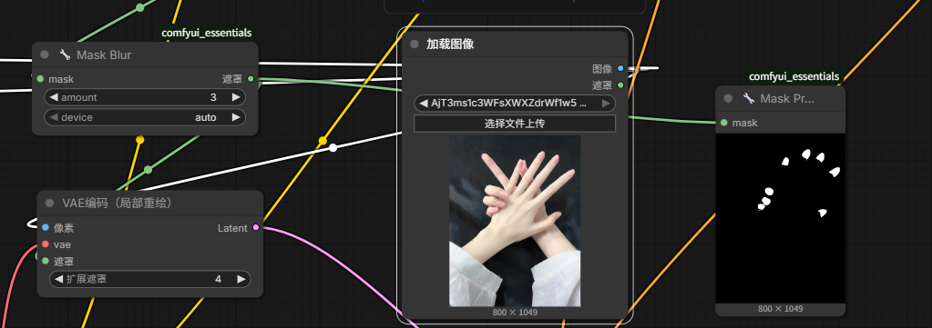 | Dilate Mask | Impact-Pack | 遮罩形态学处理 | dilation | 边缘伸缩:重点!设为 负数(如 -8)代表向内收缩。防止美甲油“溢出”到手指缝。 |