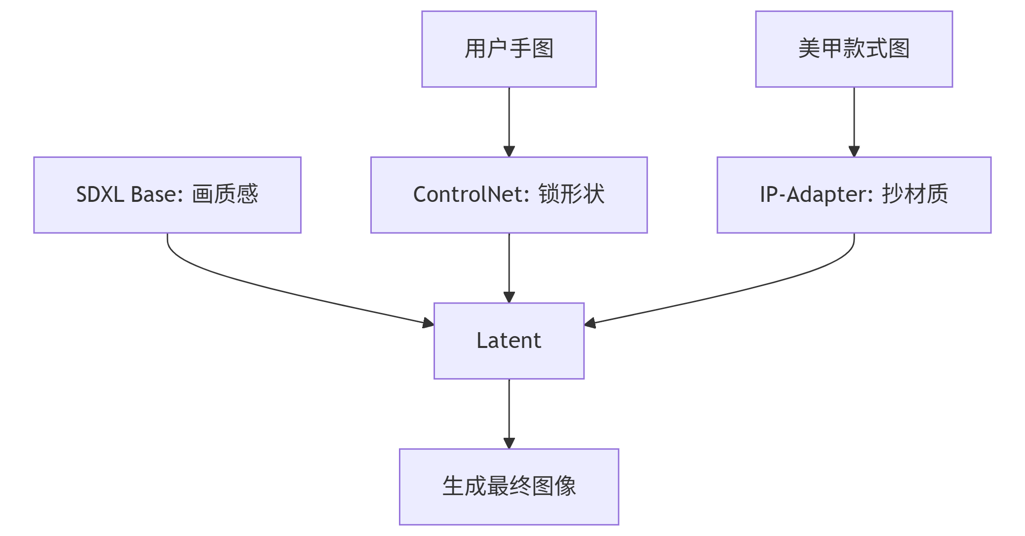 优势:相比 SD1.5 的 512px,SDXL 原生支持 1024px 分辨率。美甲的细节极多(闪粉、纹理),SD1.5 往往生成出塑料感,而 SDXL 的 2.6B 参数量能准确还原皮肤毛孔和指甲光泽。