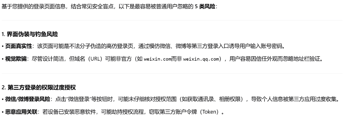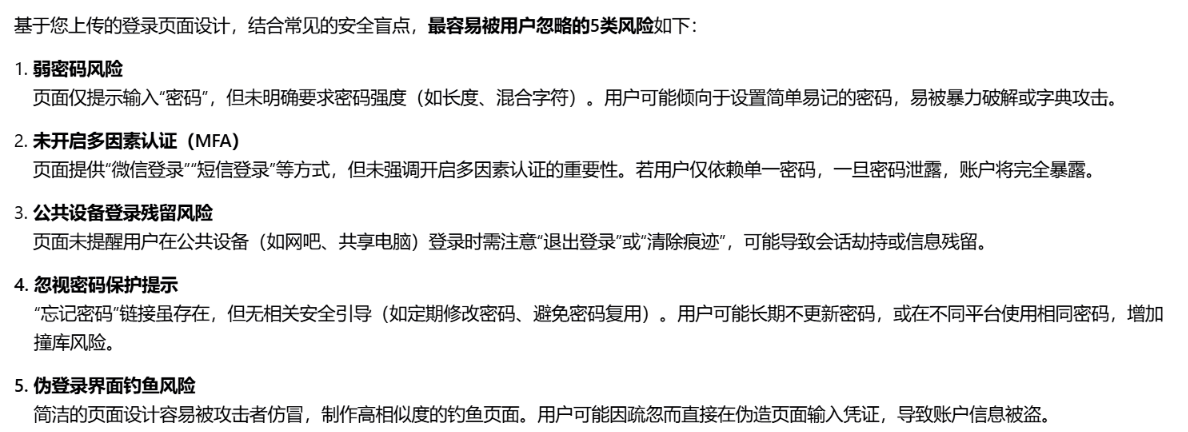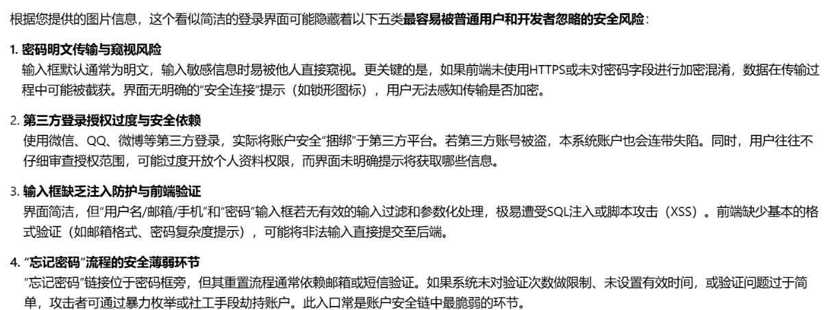 基于这个登录页,你觉得最容易被忽略的 5 类风险是什么?