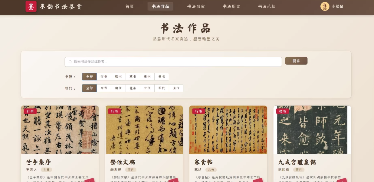 书法作品模块(列表浏览、详情查看、按书体/朝代筛选、关键词搜索、作品收藏)
