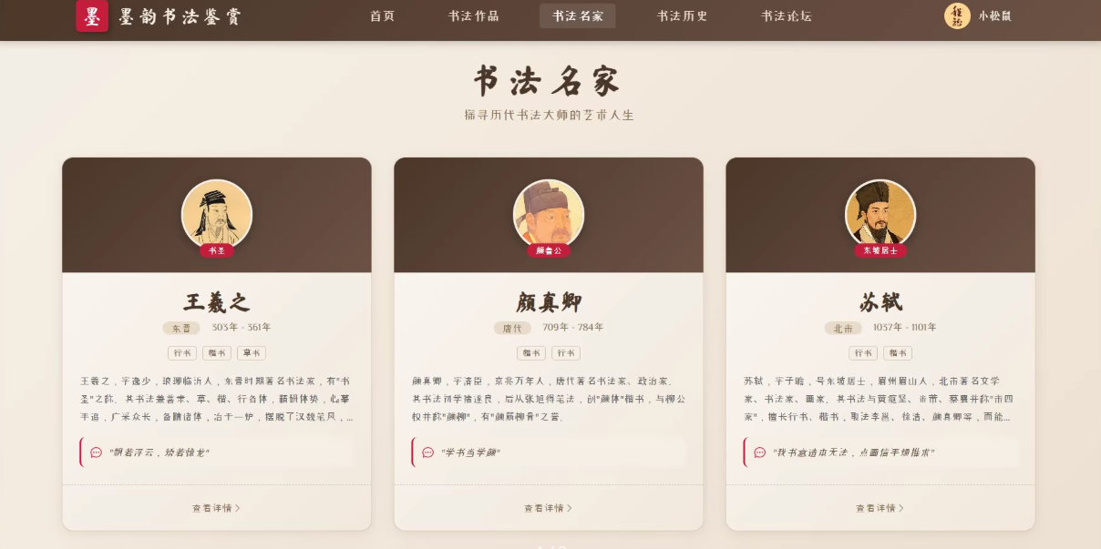 书法名家模块(书法家列表、详情查看、生平介绍、主要成就、相关作品展示)