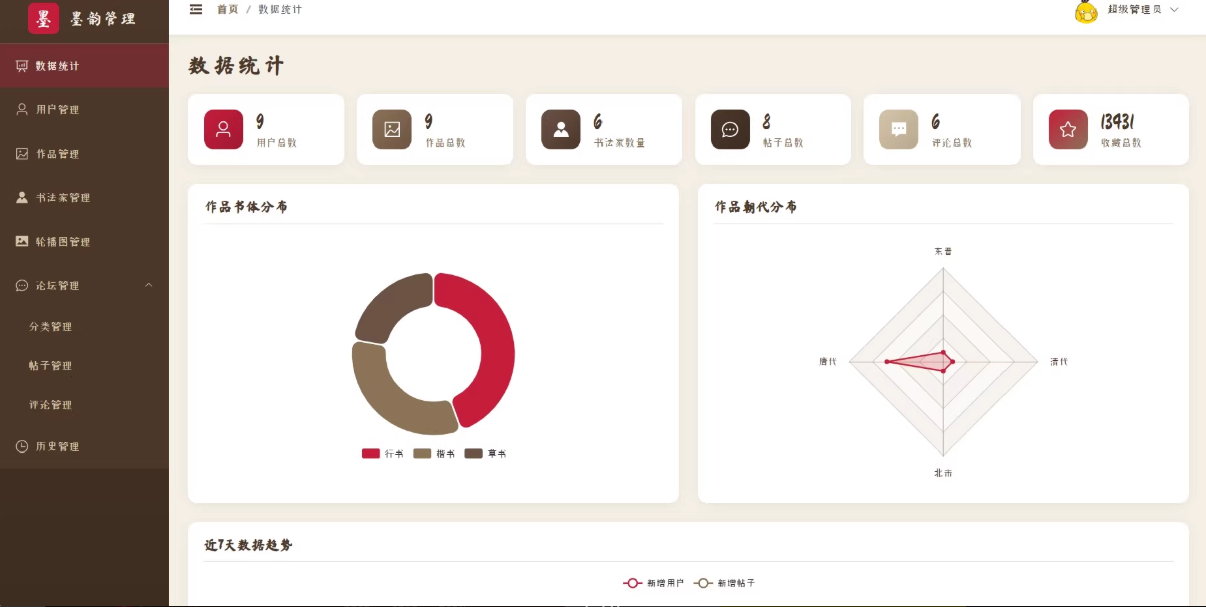 数据概览模块(用户/作品/书法家/帖子/评论/收藏统计、ECharts可视化图表)