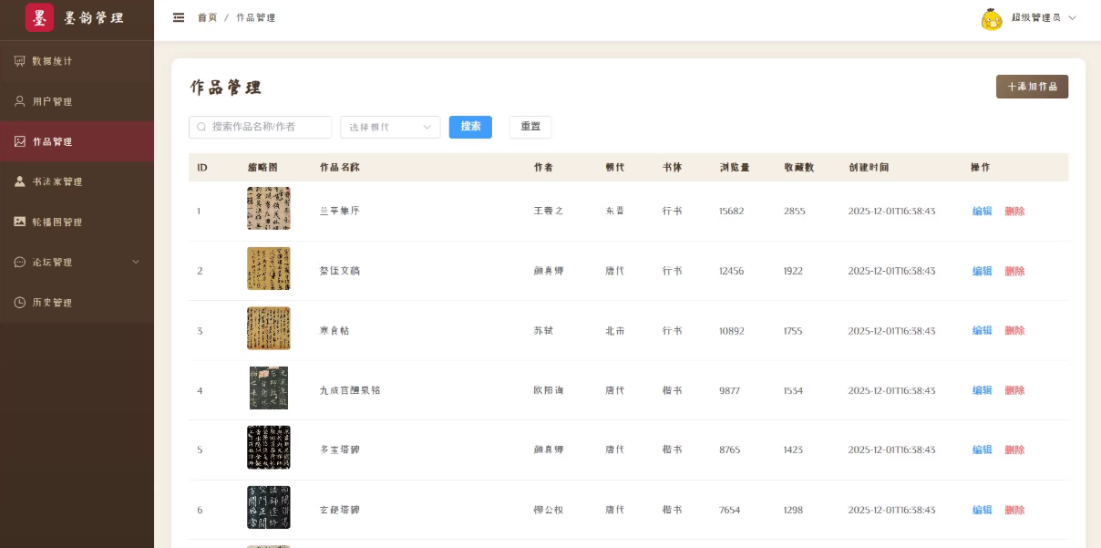 书法作品管理模块(增删改查、图片上传、书体/朝代筛选)
