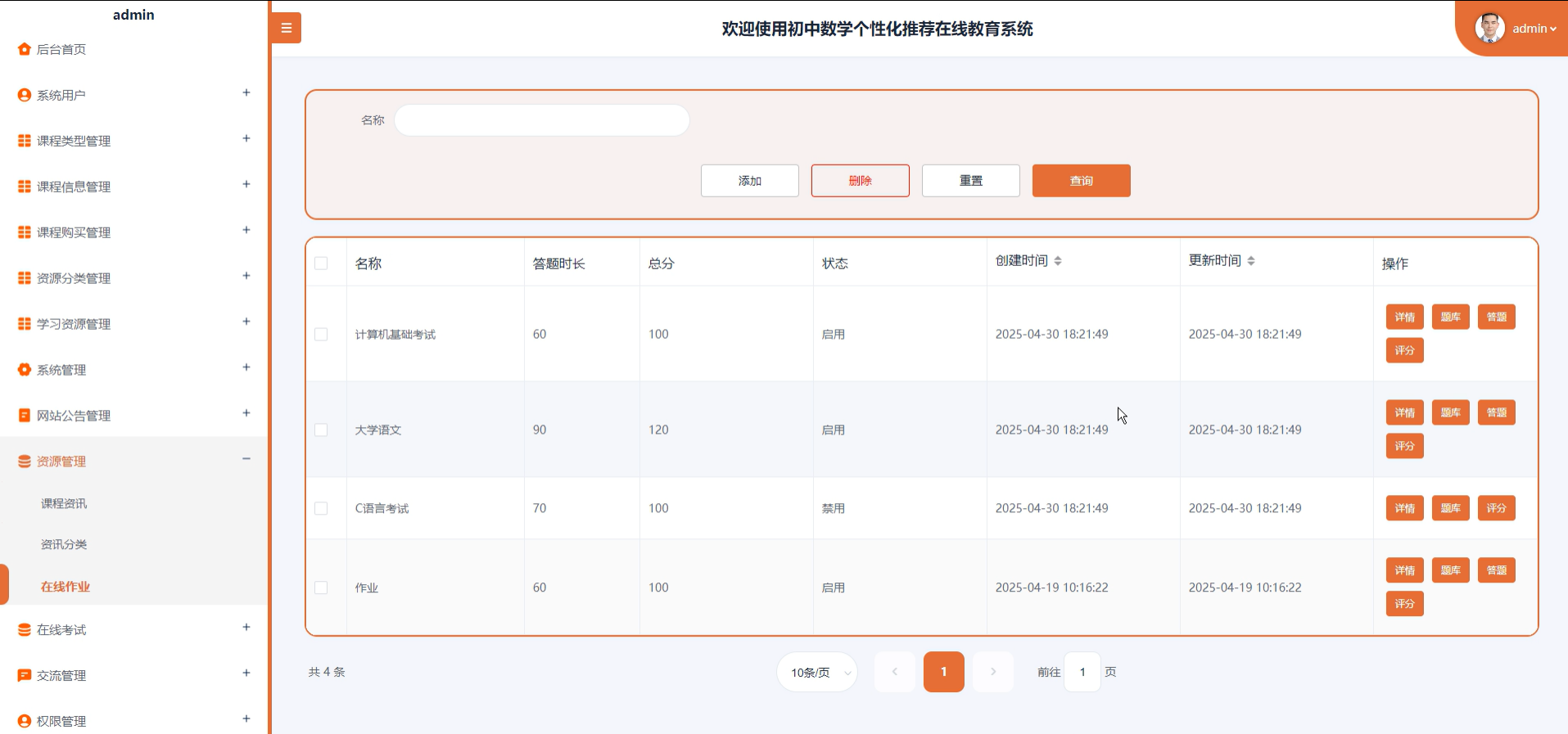 5. 资源管理(在线作业):创建、发布、管理在线作业,并查看学生的提交情况。