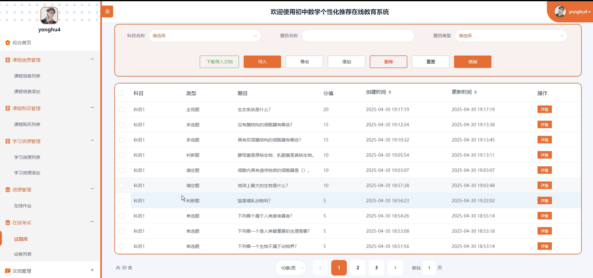 11. 在线考试(科目列表、试题库、错题记录、试卷列表):管理考试科目、试题库、错题记录及生成试卷的功能。