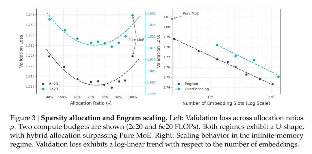 图 3(右)展示了增加内存槽数量会显著改善验证损失,并且这一改进在整个范围内持续稳定。该曲线遵循严格的幂律(在对数空间中线性),这表明 Engram 提供了一个可预测的扩展旋钮:更大的内存在不需要额外计算的情况下继续带来收益。