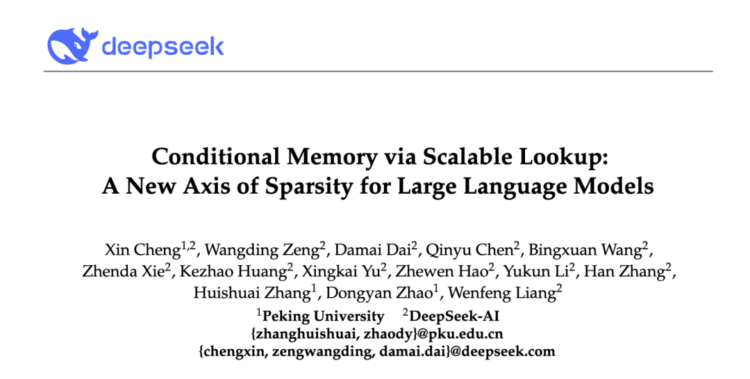 就在十几个小时前,DeepSeek 发布了一篇新论文,主题为《Conditional Memory via Scalable Lookup:A New Axis of Sparsity for Large Language Models》,与北京大学合作完成,作者中同样有梁文锋署名。