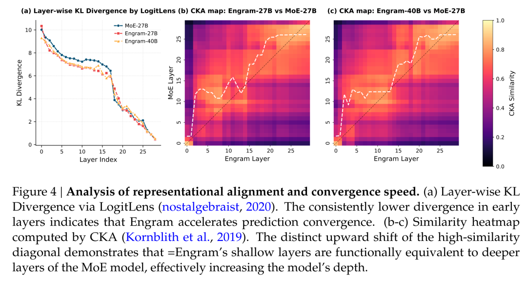最后,下图 4 是对表示对齐与收敛速度的分析。(a) 基于 LogitLens 的逐层 KL 散度分析。在模型浅层,KL 散度持续保持在较低水平,这表明 Engram 加速了预测的收敛。(b-c) 为基于 CKA 计算的相似度热力图。高相似度对角线显著的向上偏移表明,Engram 的浅层在功能上等效于 MoE 模型的深层,从而有效地增加了模型的深度。