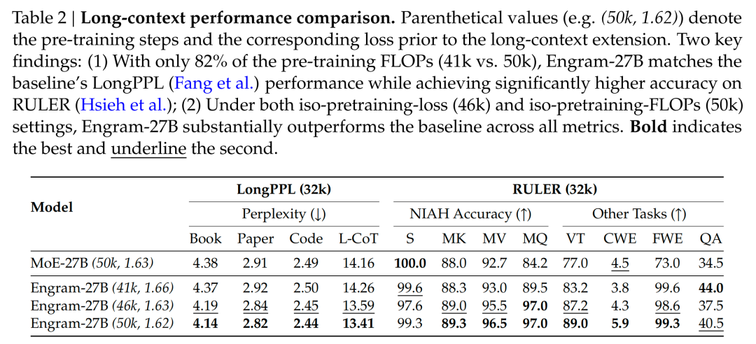 - 极端设置(约 82% 计算量):即使是提前停止训练的 Engram-27B(41k 步),在面对完整训练的 MoE-27B(50k 步)时依然极具竞争力。它在 LongPPL 指标上与基准持平,并在 RULER 测试中实现超越,这充分证明了 Engram 架构的内在优越性。