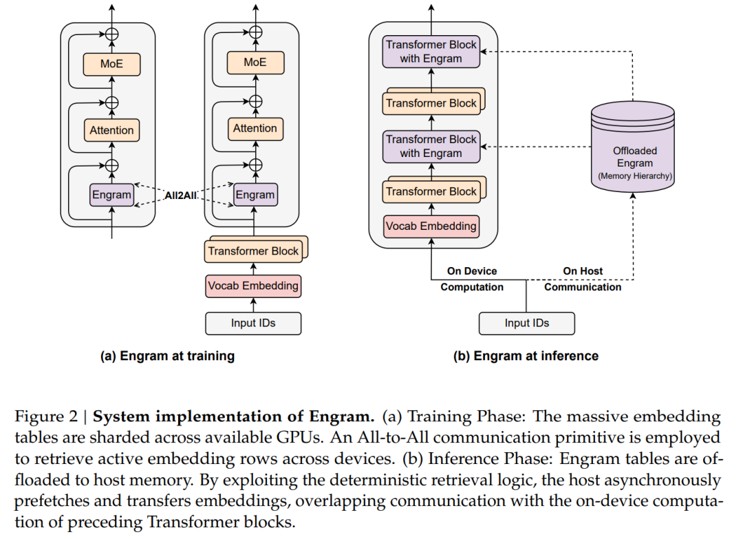 在带有记忆机制的模型中,规模扩展往往受到 GPU 高带宽显存(HBM)容量有限的制约。然而,Engram 所采用的确定性检索机制天然支持将参数存储与计算资源进行解耦。不同于 MoE 依赖运行时隐藏状态进行动态路由,Engram 的检索索引完全由输入 token 序列决定。这种可预测性使得针对训练与推理阶段的专门优化策略成为可能,如图 2 所示。