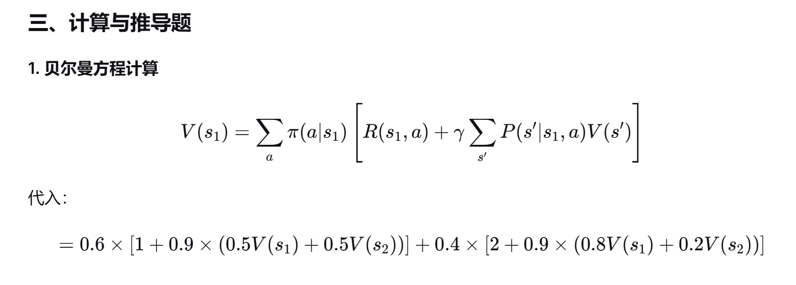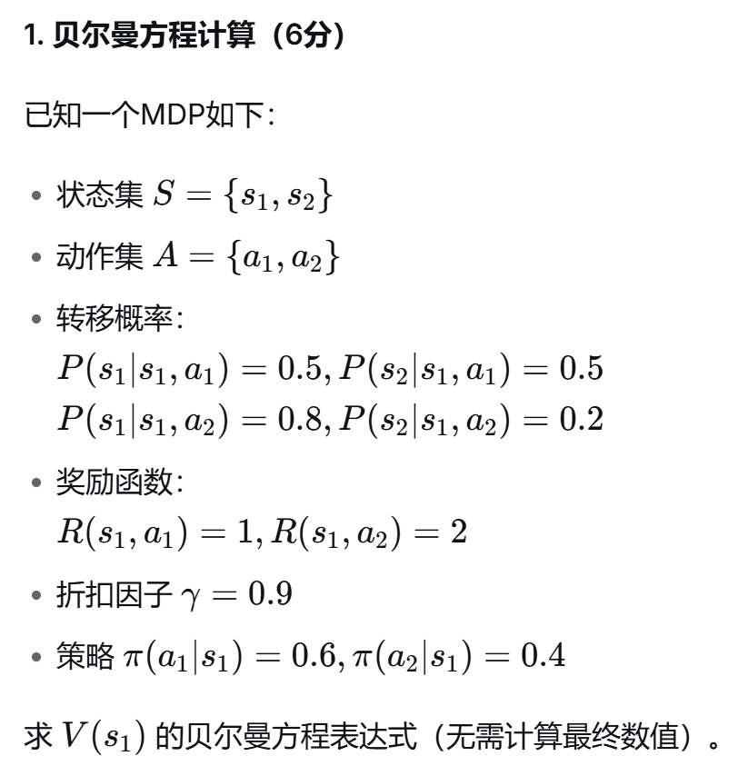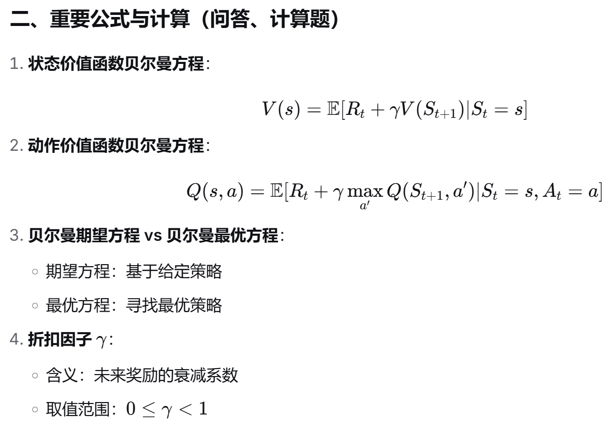 | 贝尔曼方程形式 | 中 | 填空/简答 | 要求写出状态价值函数或动作价值函数的贝尔曼方程 |