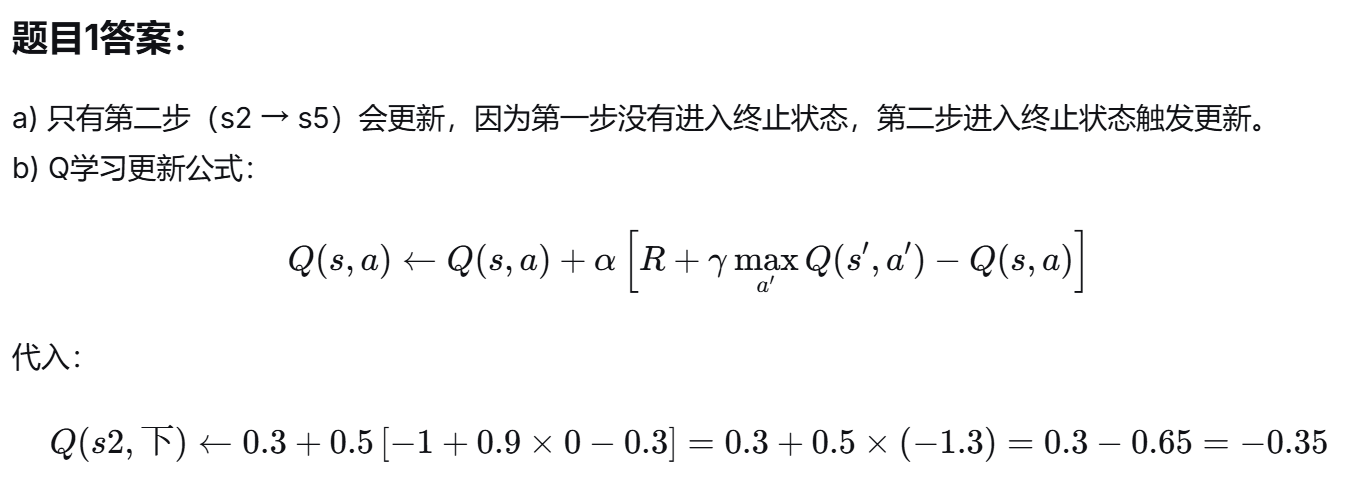 | Q学习单步更新 | 高 | 计算题 | 常给一个网格环境,要求计算更新后的Q值 |